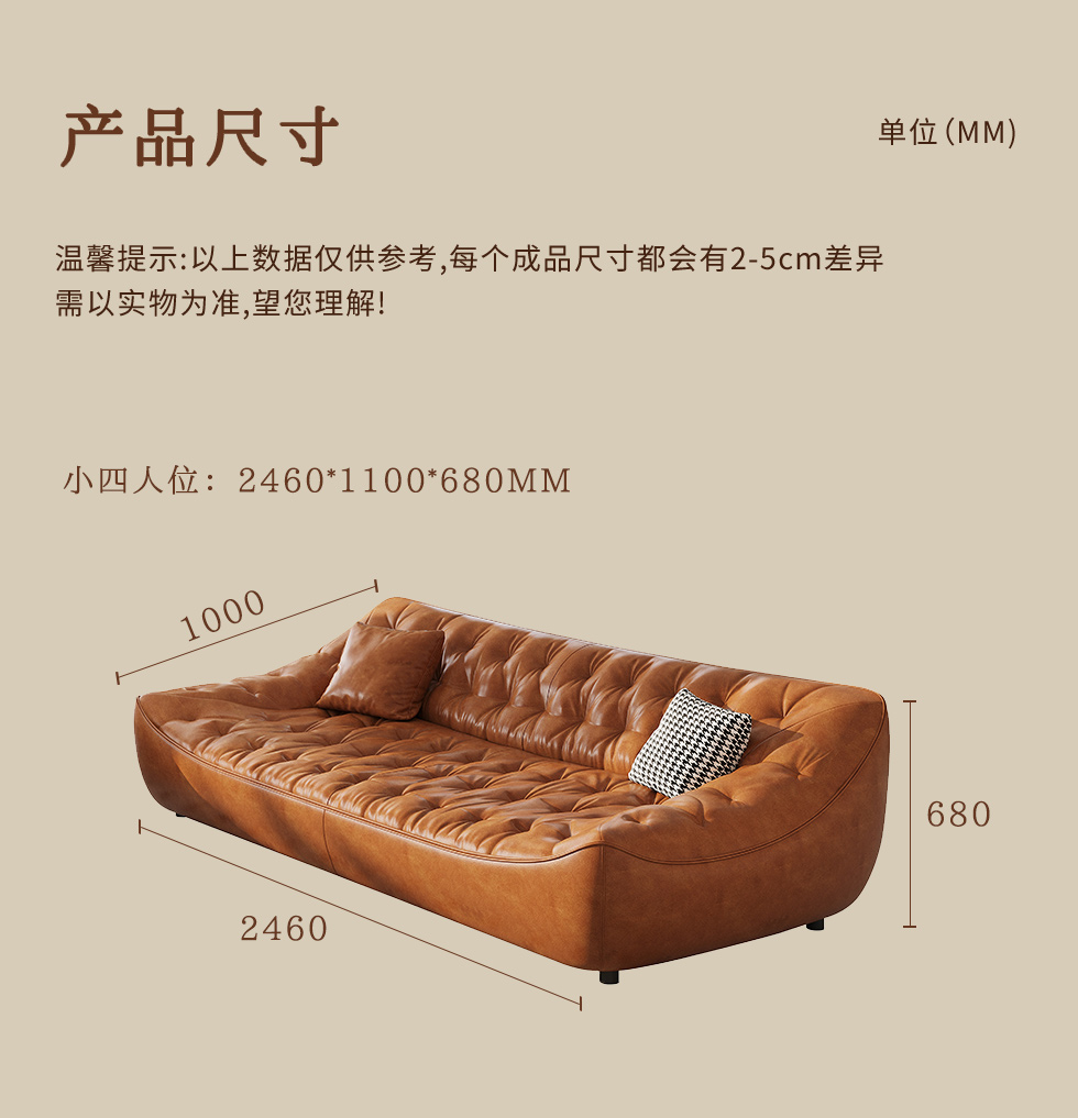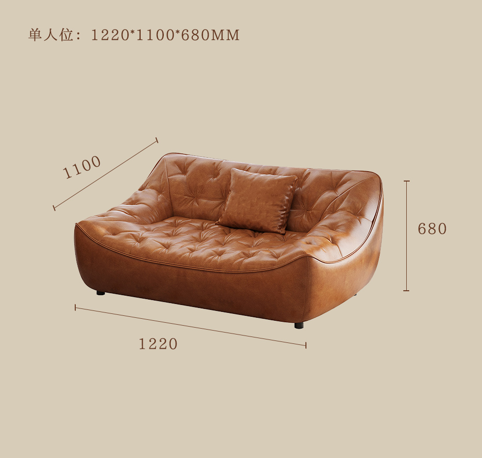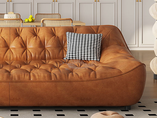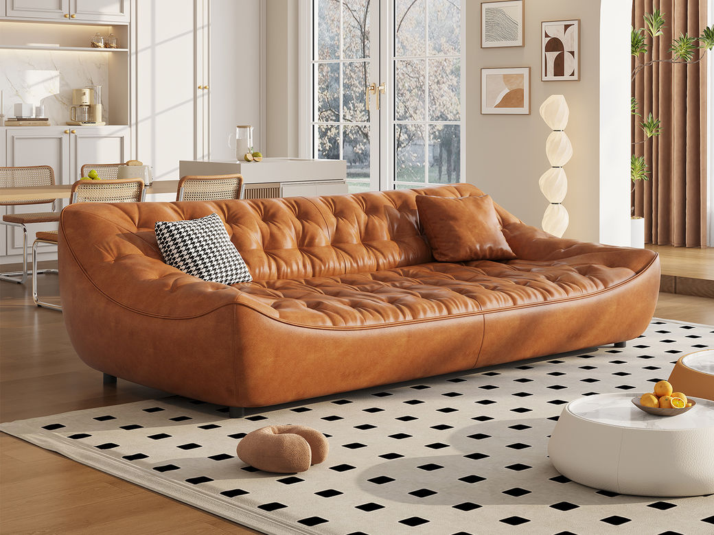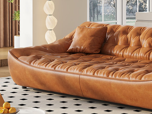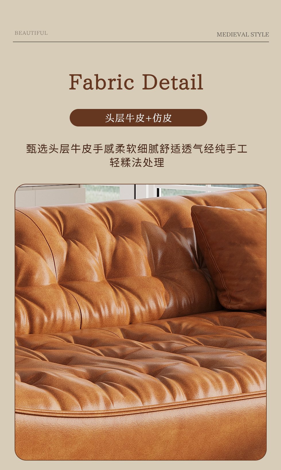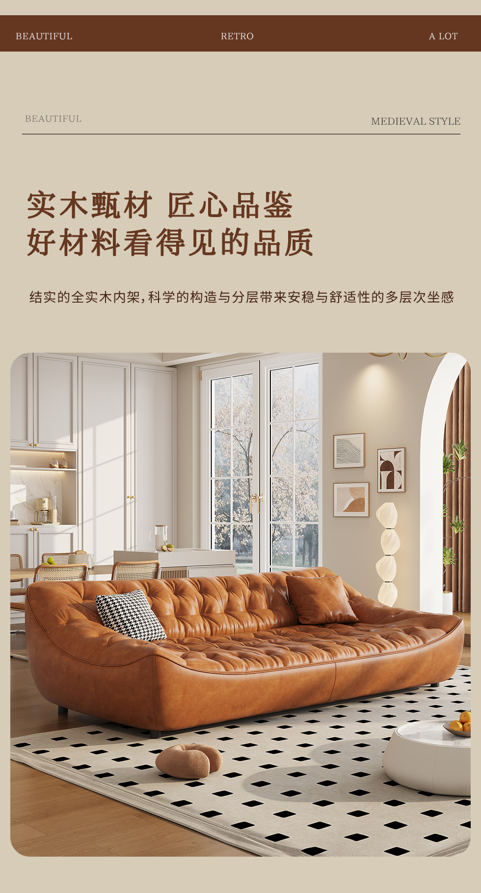 中古·尚 网红 中古风 接触面头层牛皮+框架落叶松木+多层实木夹板+实木脚 2.85米四人位 分体 沙发