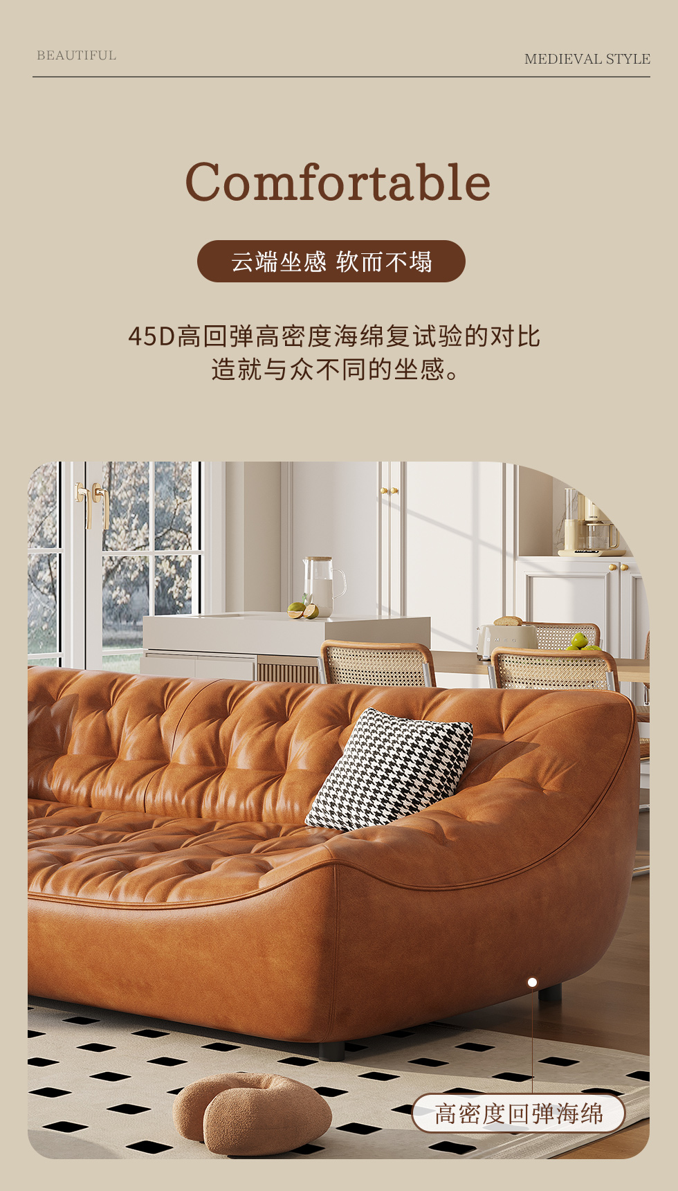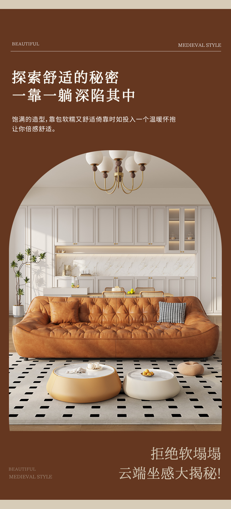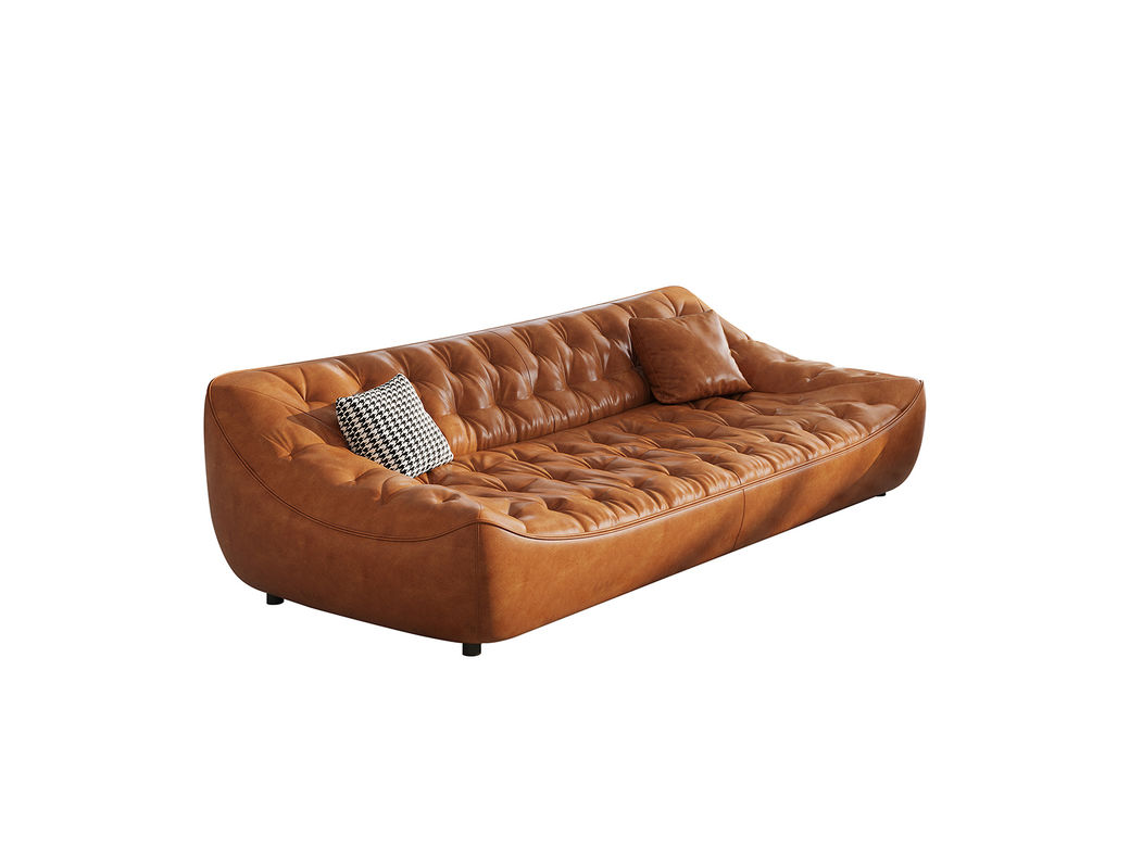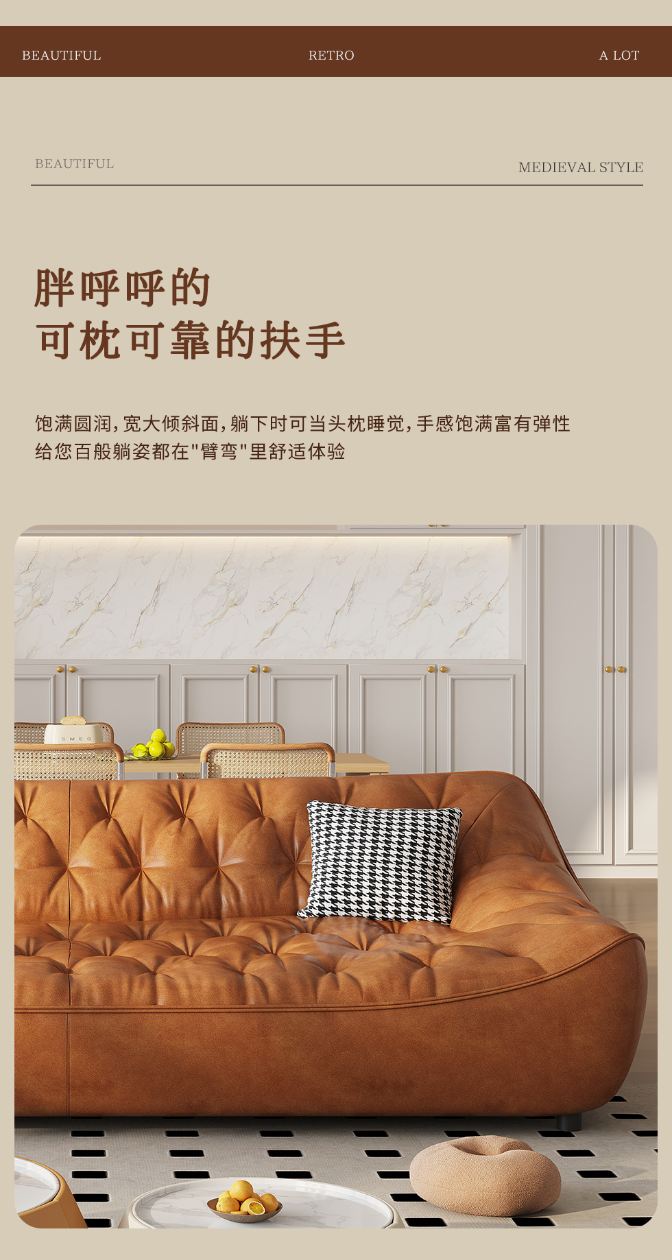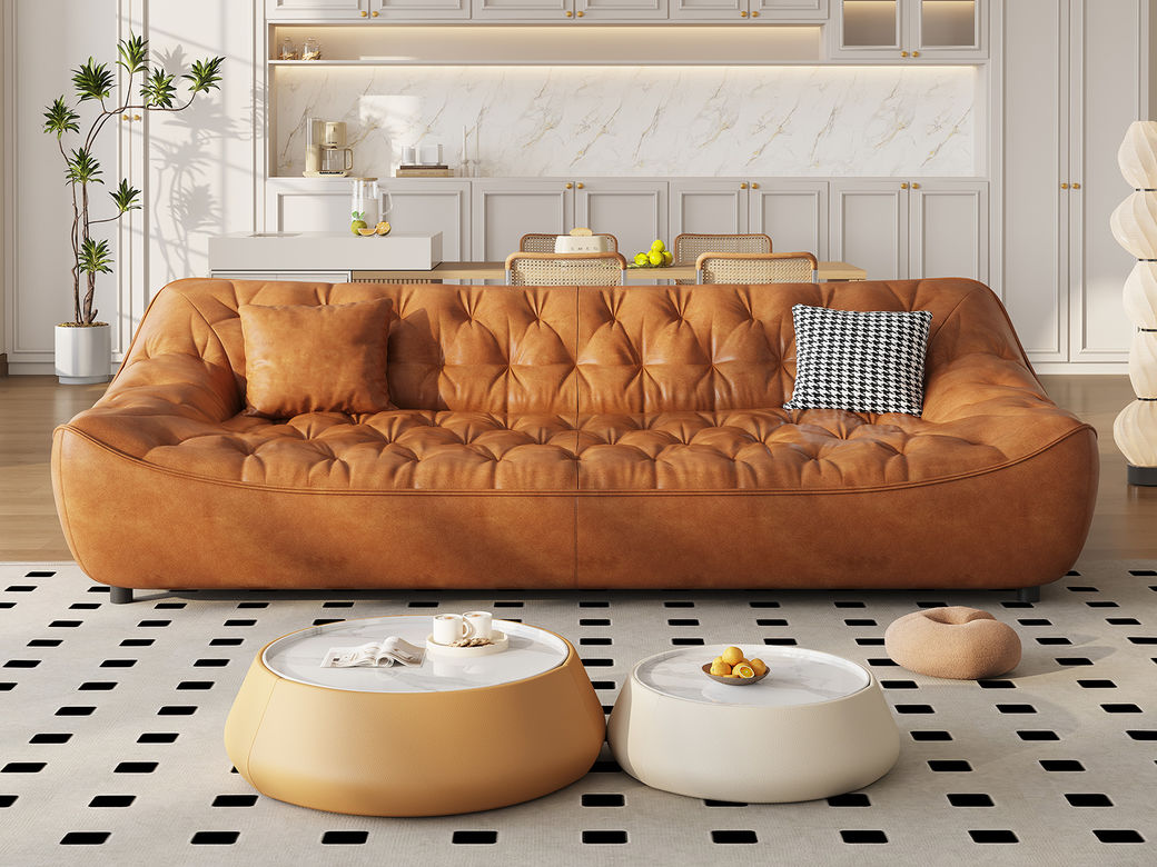 中古·尚 网红 中古风 接触面头层牛皮+框架落叶松木+多层实木夹板+实木脚 2.85米四人位 分体 沙发