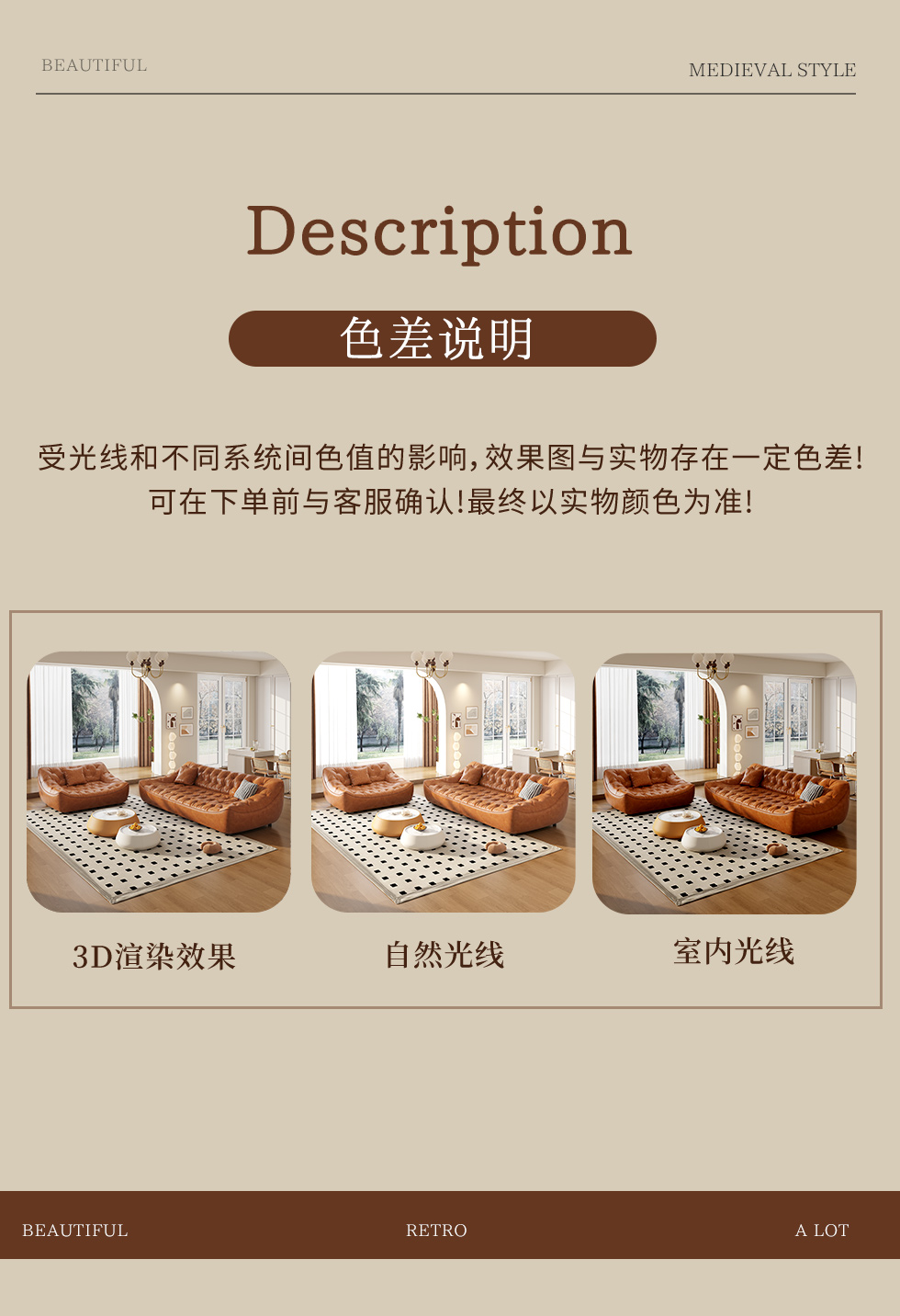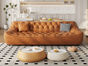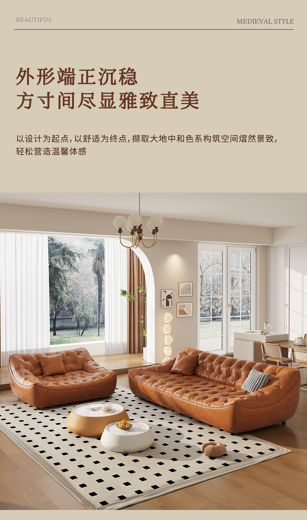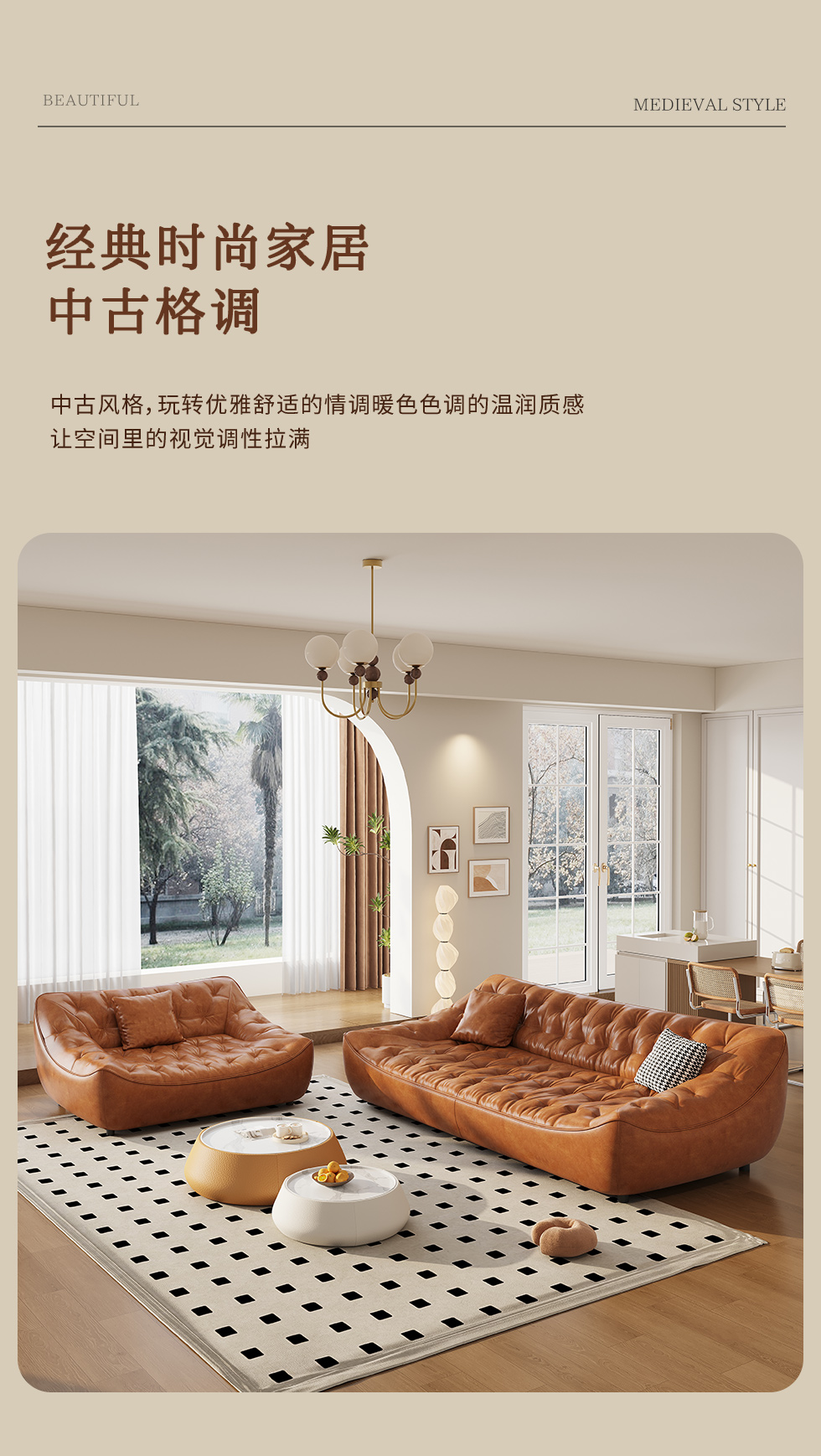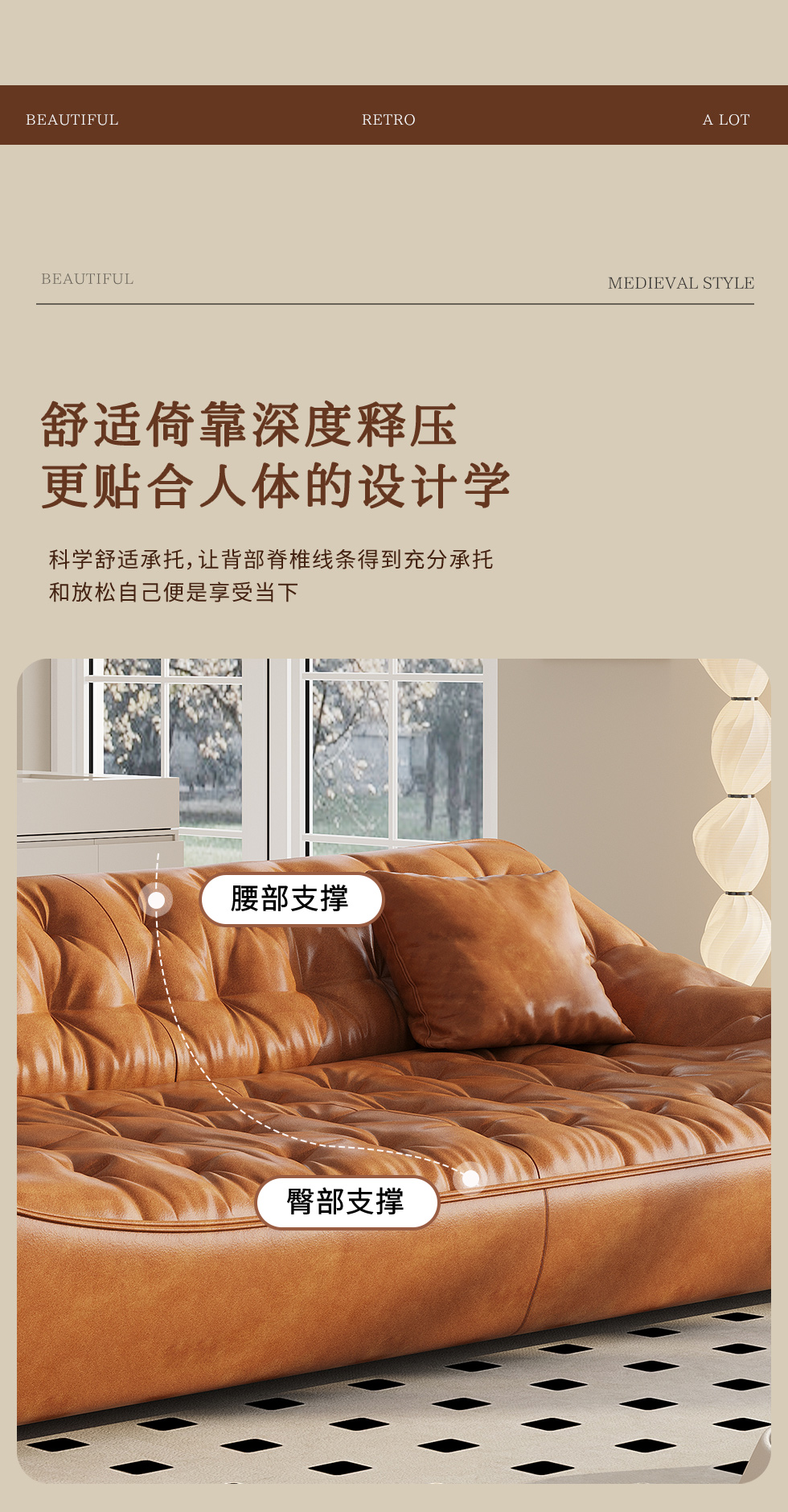 中古·尚 网红 中古风 接触面头层牛皮+框架落叶松木+多层实木夹板+实木脚 2.85米四人位 分体 沙发