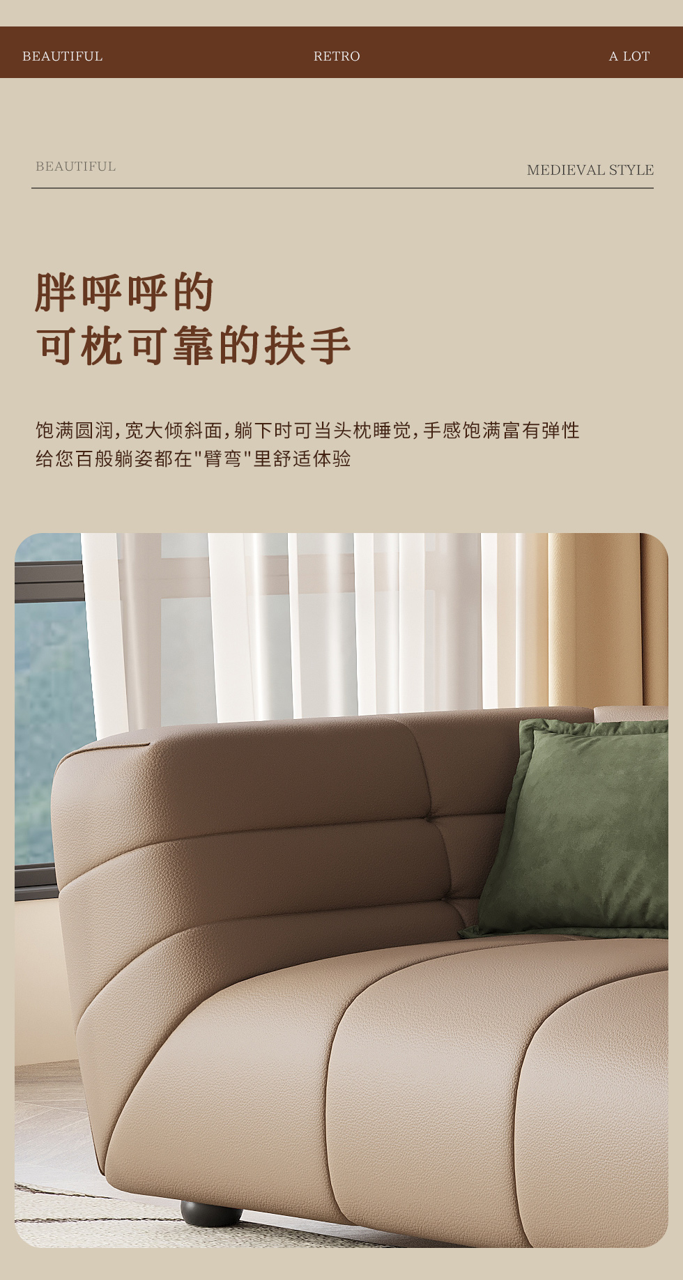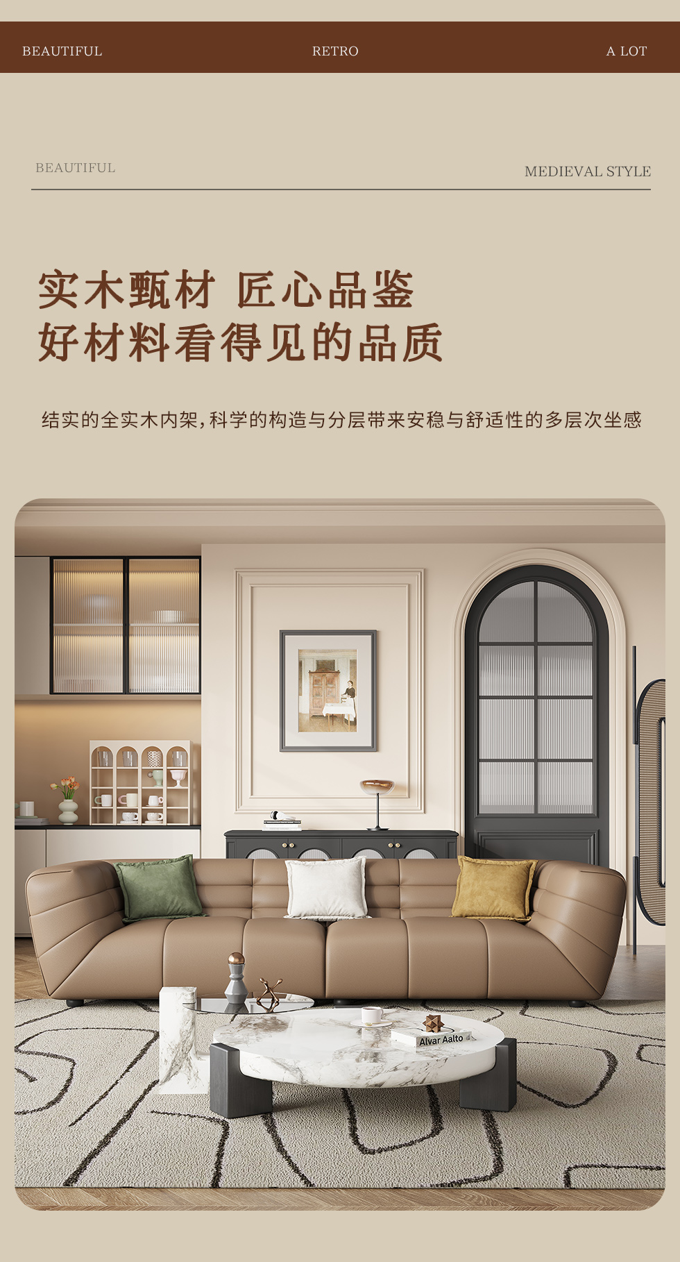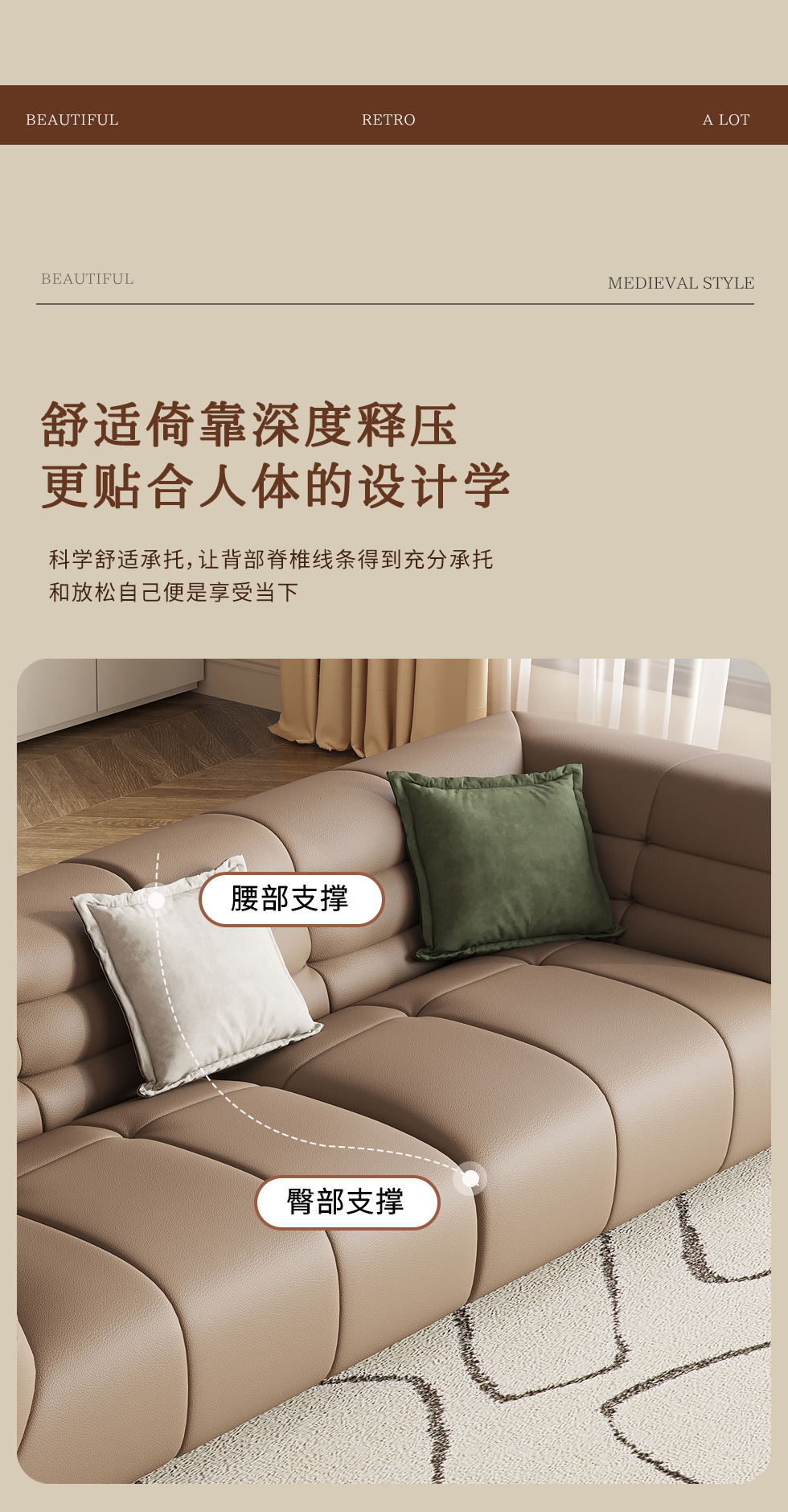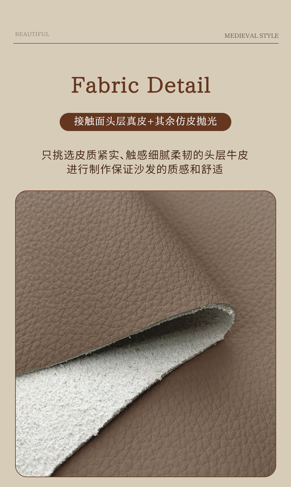 中古·尚 中古风 接触面头层真皮+其余仿皮抛光实木框架+实木多层板 奶咖色 四位 2.8米沙发