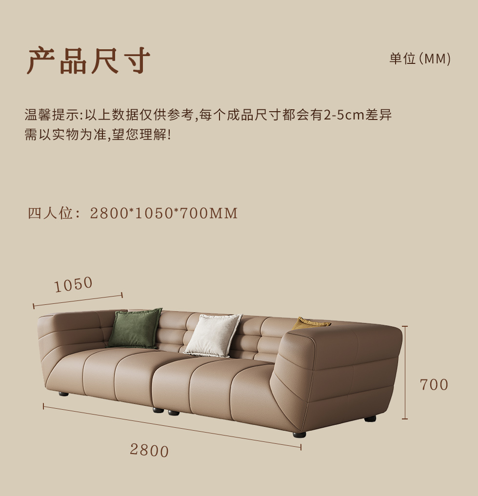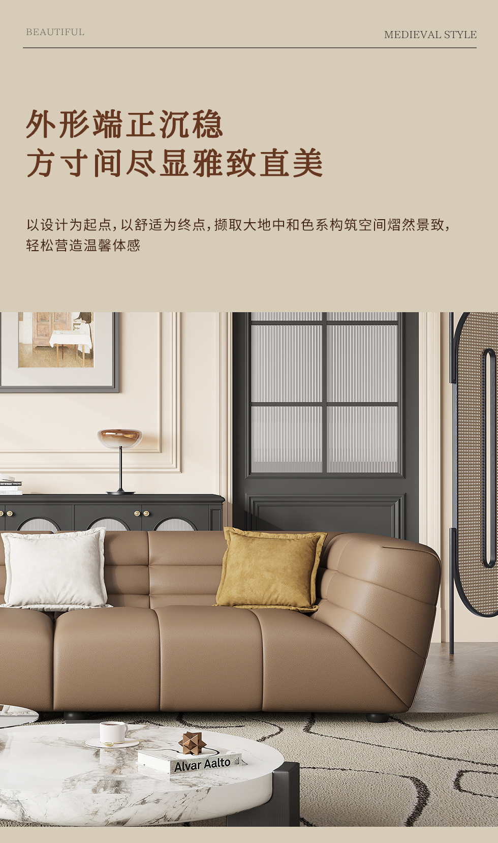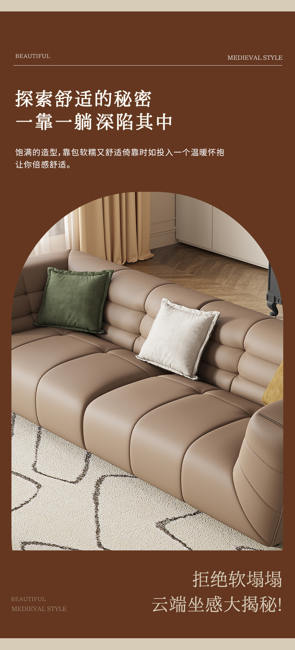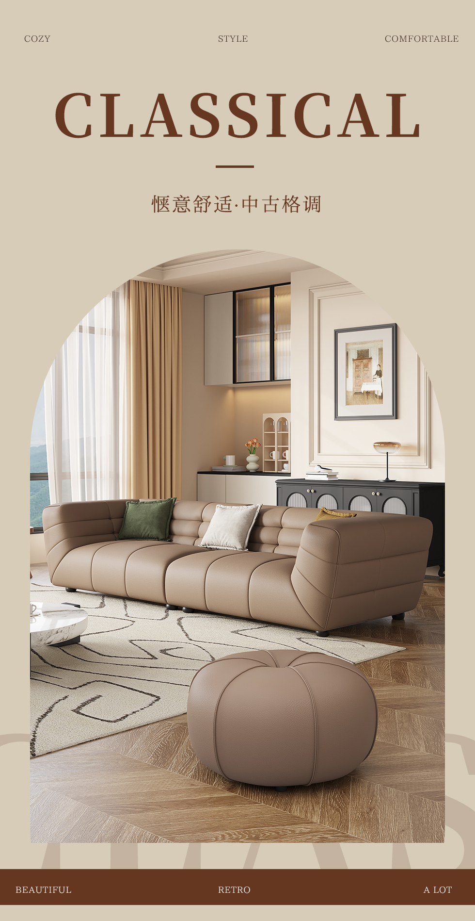 中古·尚 中古风 接触面头层真皮+其余仿皮抛光实木框架+实木多层板 奶咖色 四位 2.8米沙发