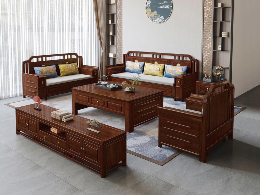 风华绝代 新中式 印尼金花梨木框架+多层实木板贴皮+布艺 紫檀色 1+2+3+茶几+边几+电视柜(六件套) 沙发组合¥9651