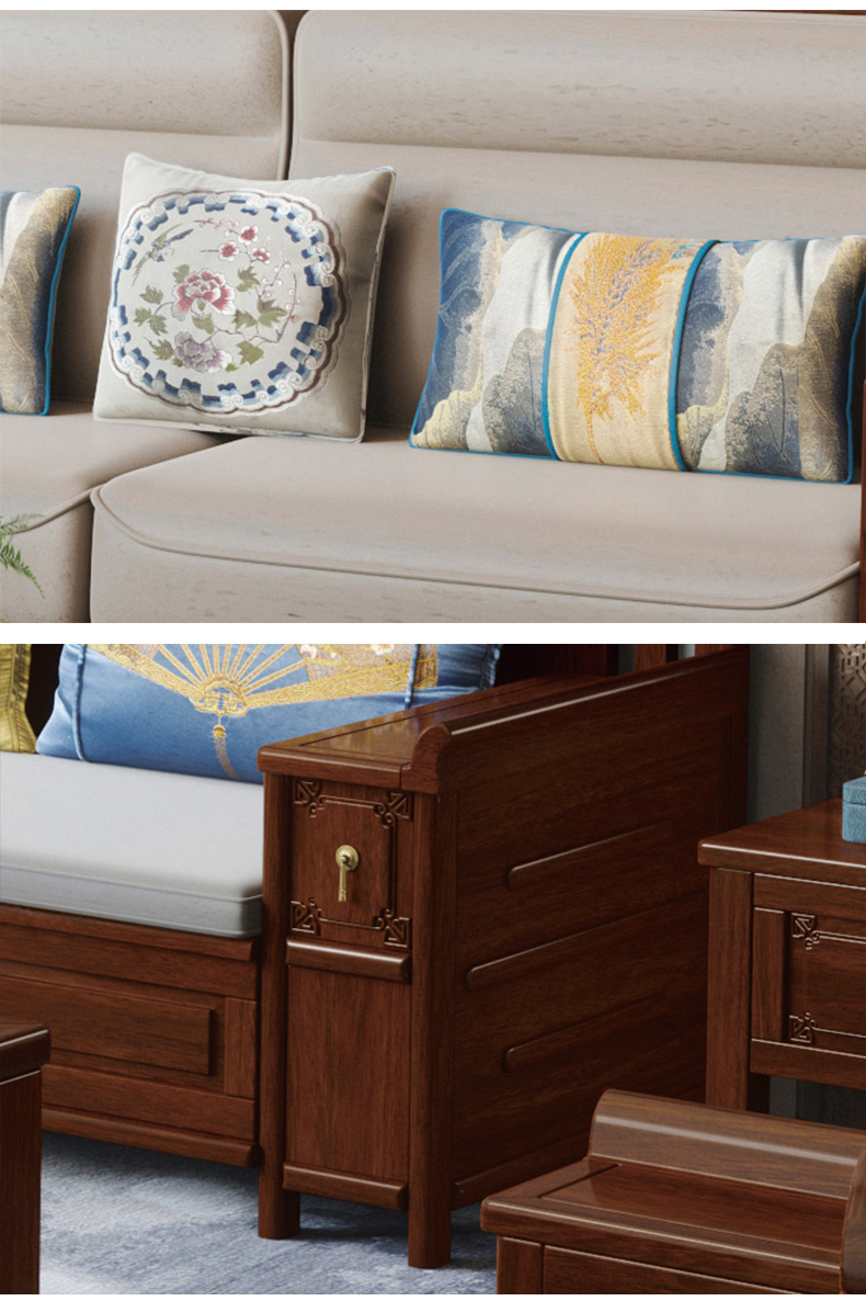 风华绝代 新中式 印尼金花梨木框架+多层实木板贴皮+布艺 紫檀色 1+2+3+茶几+边几+电视柜(六件套) 沙发组合¥19511
