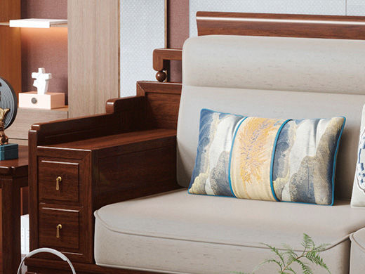 宝瑞·檀风 新中式 印尼金花梨木框架+多层实木板贴皮+布艺 紫檀色 2+2+脚踏 3.3米沙发