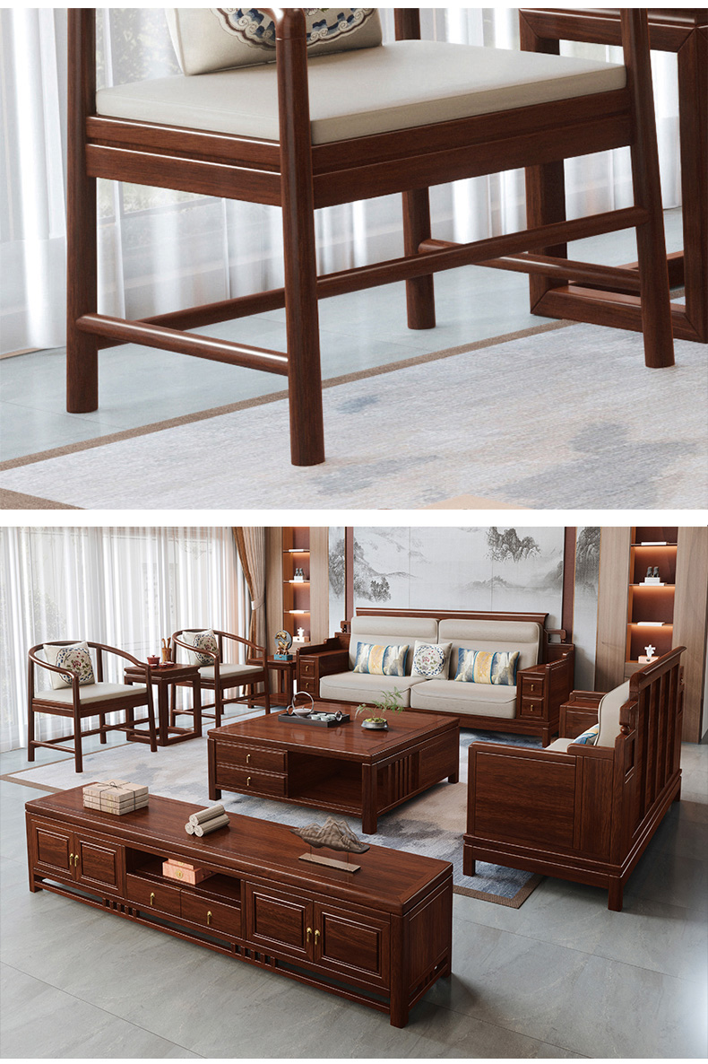 风华绝代 新中式 印尼金花梨木框架+多层实木板贴皮+布艺 紫檀色 1+2+3+茶几+边几+电视柜(六件套) 沙发组合¥11503