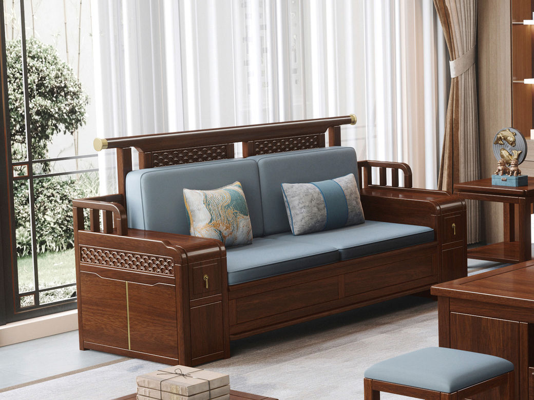 宝瑞·檀风 新中式 印尼金花梨木框架+多层实木板贴皮+布艺 紫檀色 2+2+脚踏 3.3米沙发