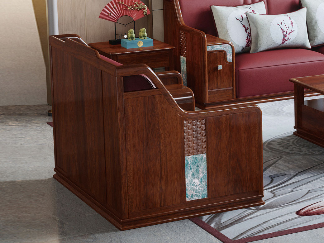 宝瑞·檀风 新中式 印尼金花梨木框架+多层实木板贴皮+布艺 紫檀色 3+1+左贵 3.6米沙发