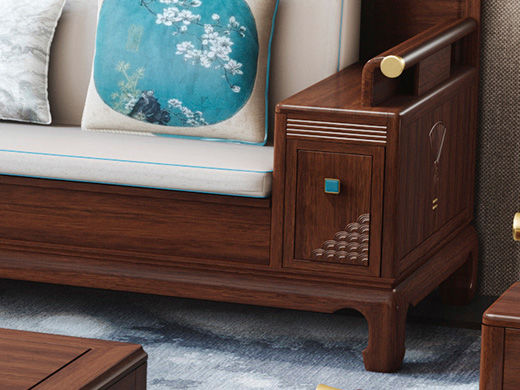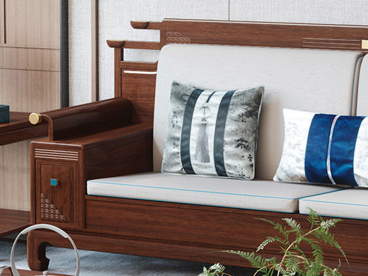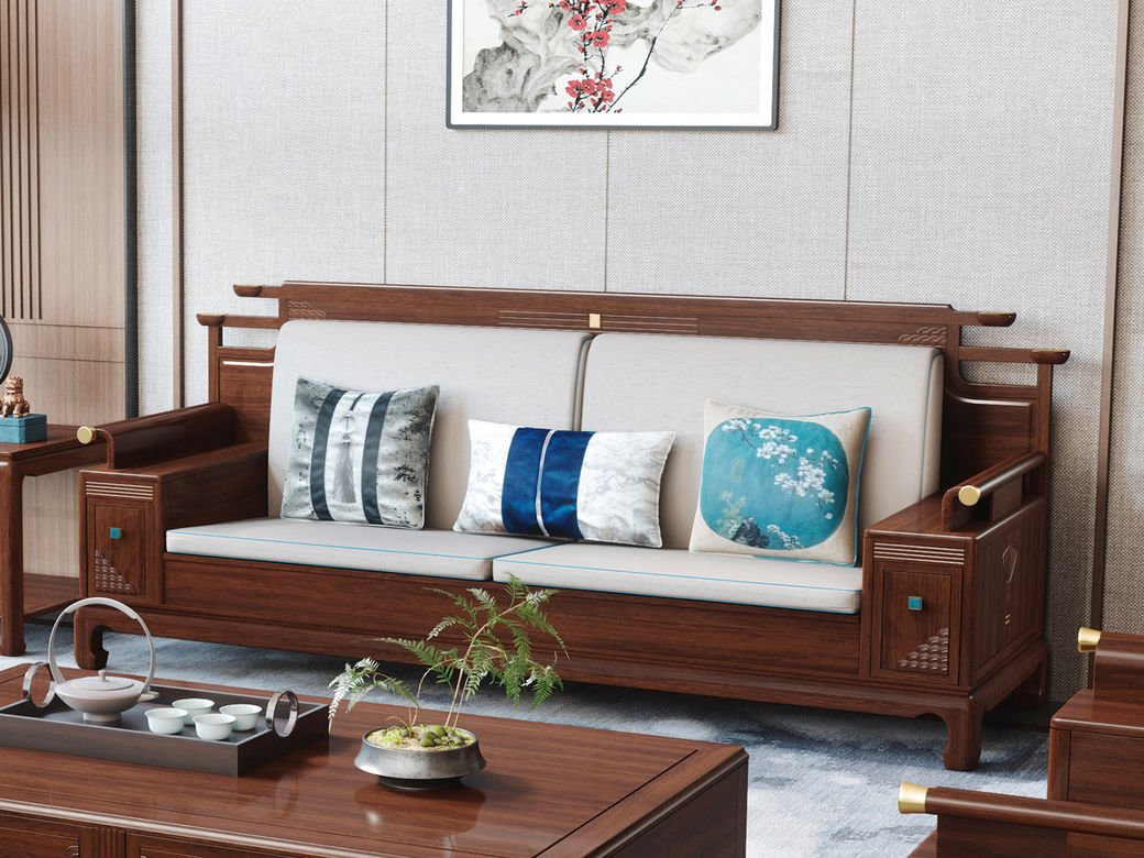 宝瑞·檀风 新中式 印尼金花梨木框架+多层实木板贴皮+布艺 紫檀色 三位 2.24米沙发