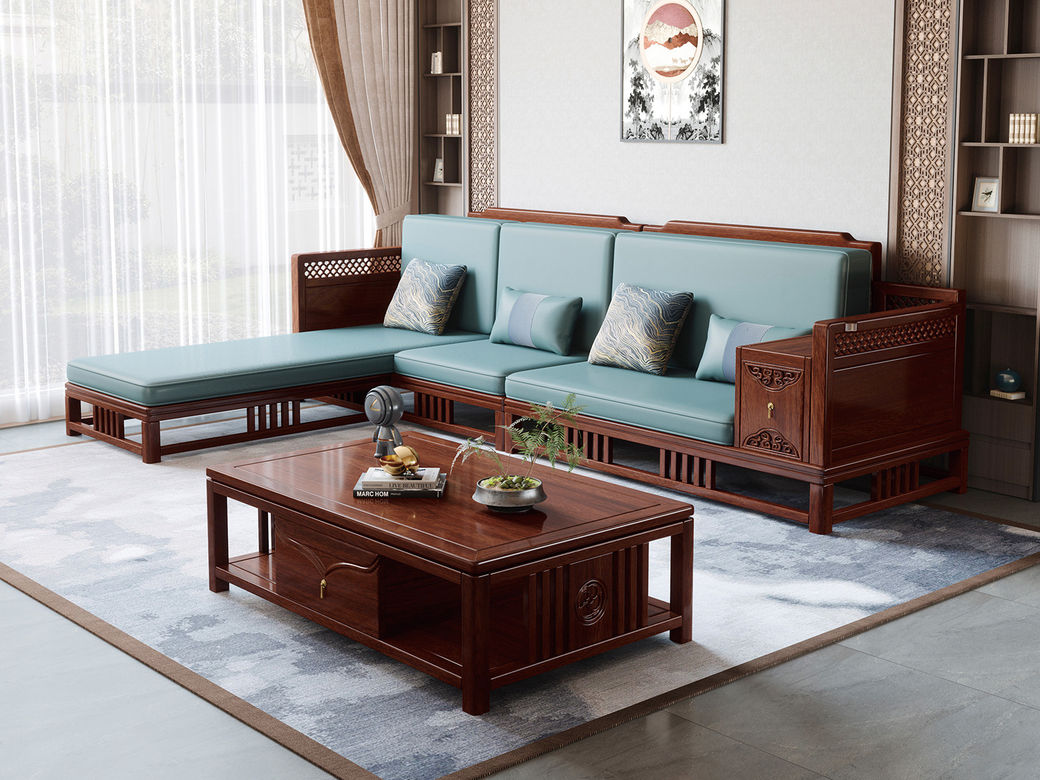 宝瑞·檀风 新中式 印尼金花梨木框架+多层实木板贴皮+布艺 紫檀色 3+1+左贵 3.6米沙发¥42130