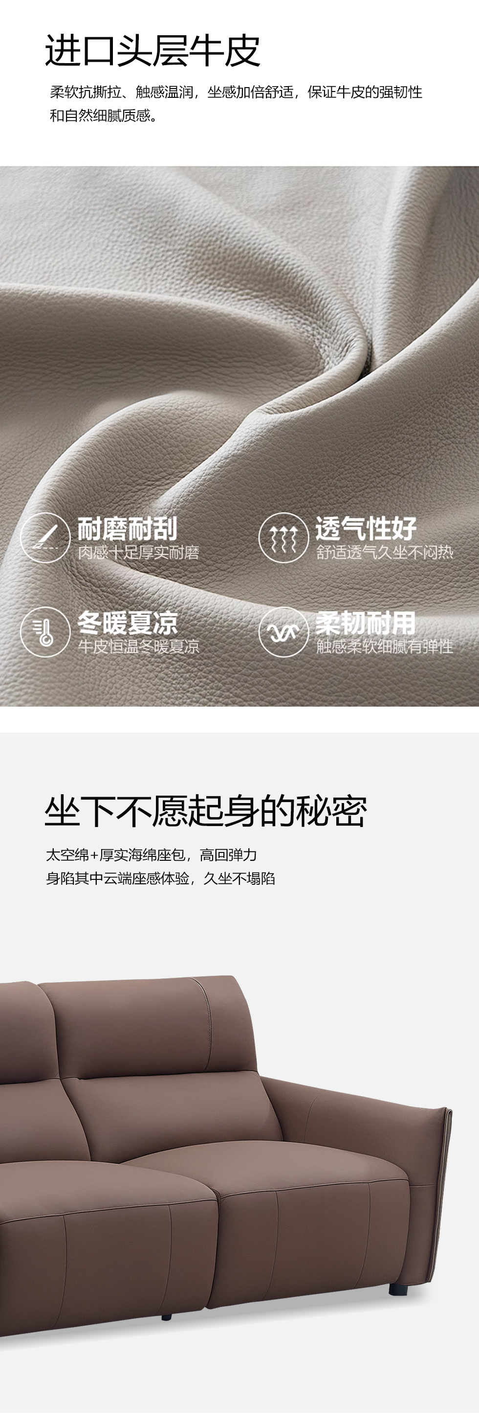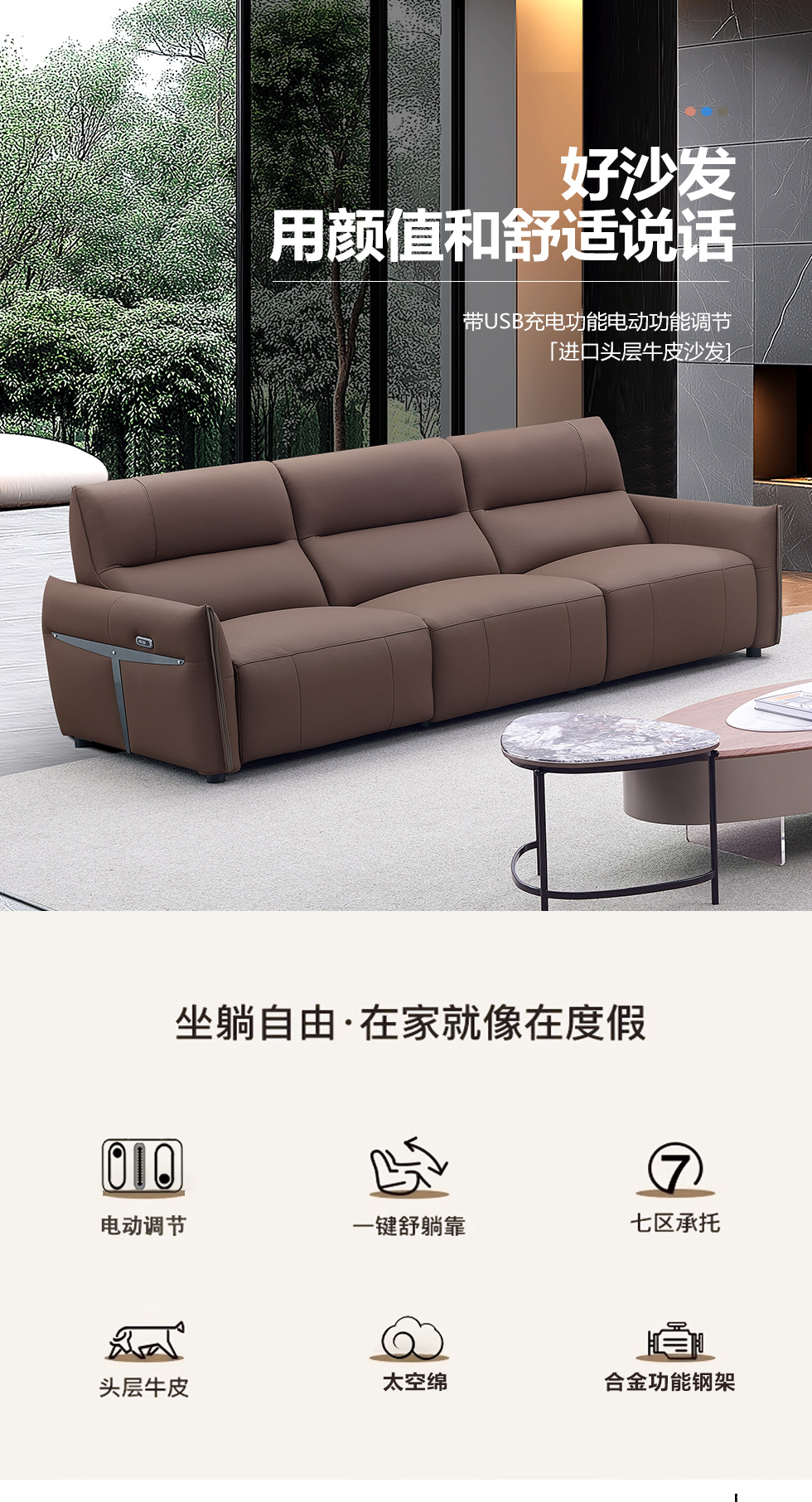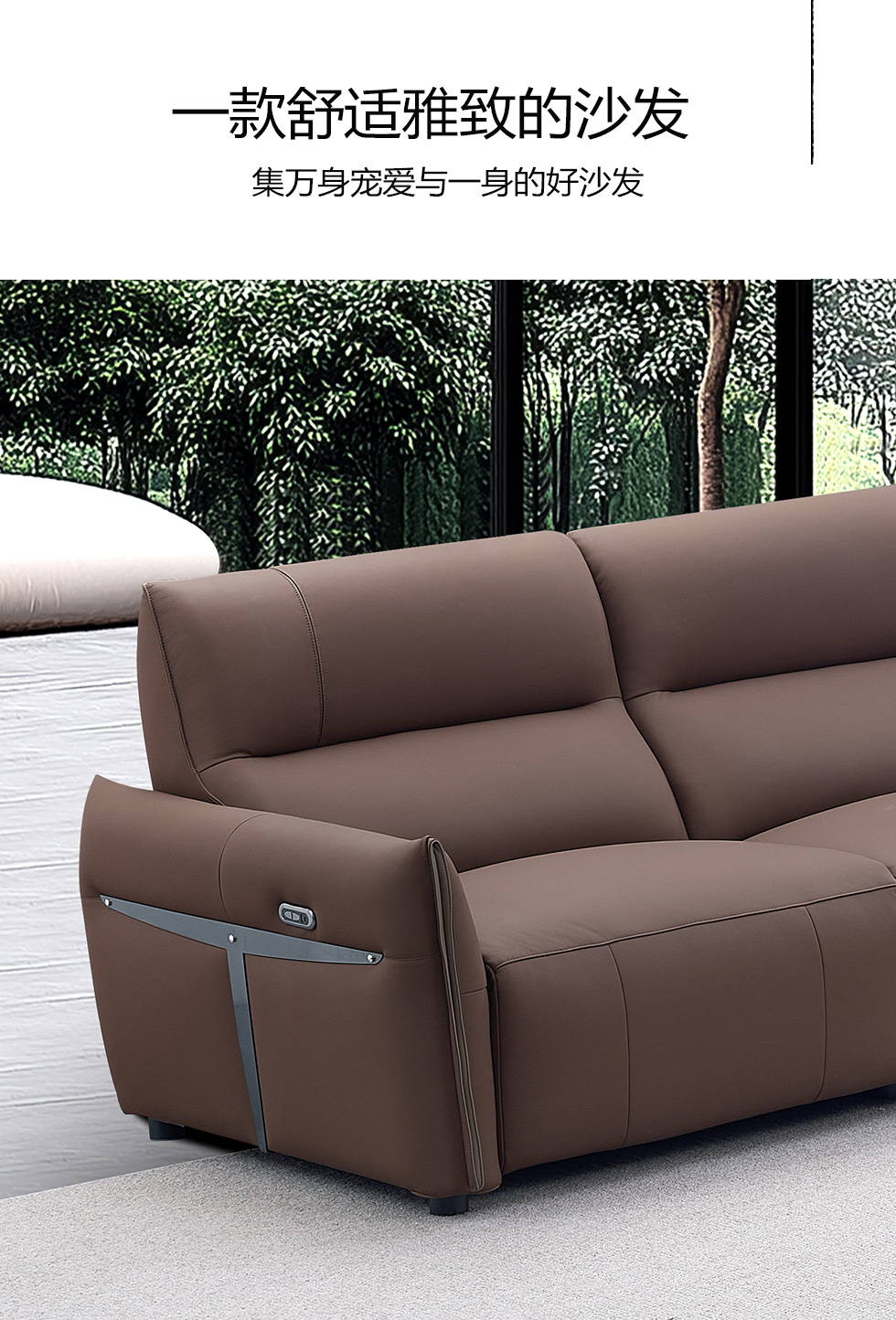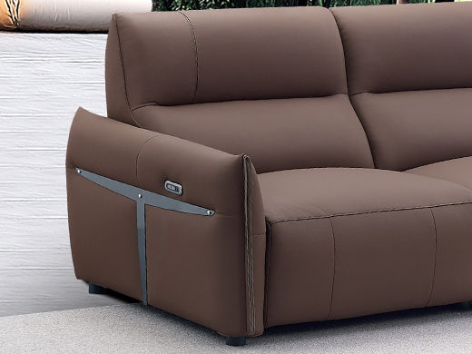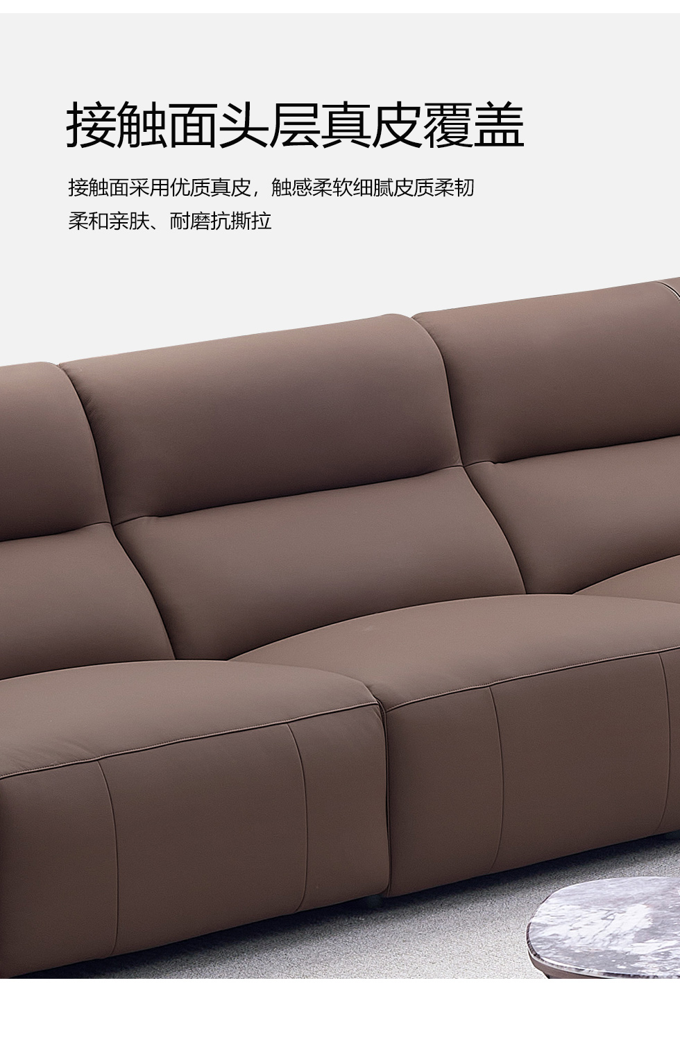 甄品家具 现代简约 接触面进口头层牛皮+进口 落叶松+高 回弹海绵+高承重碳 钢功能架+零靠墙锐迈电机+单电动功能 碳素钢脚 3.1米 三人位 单电动功能沙发