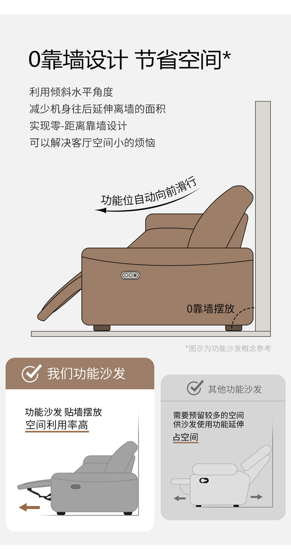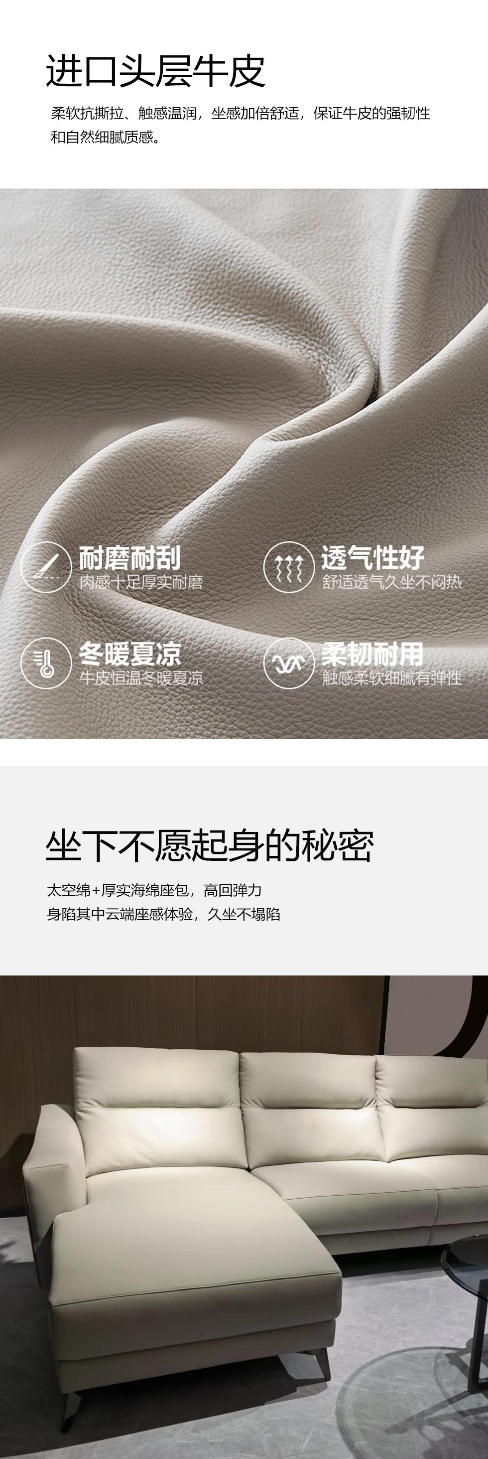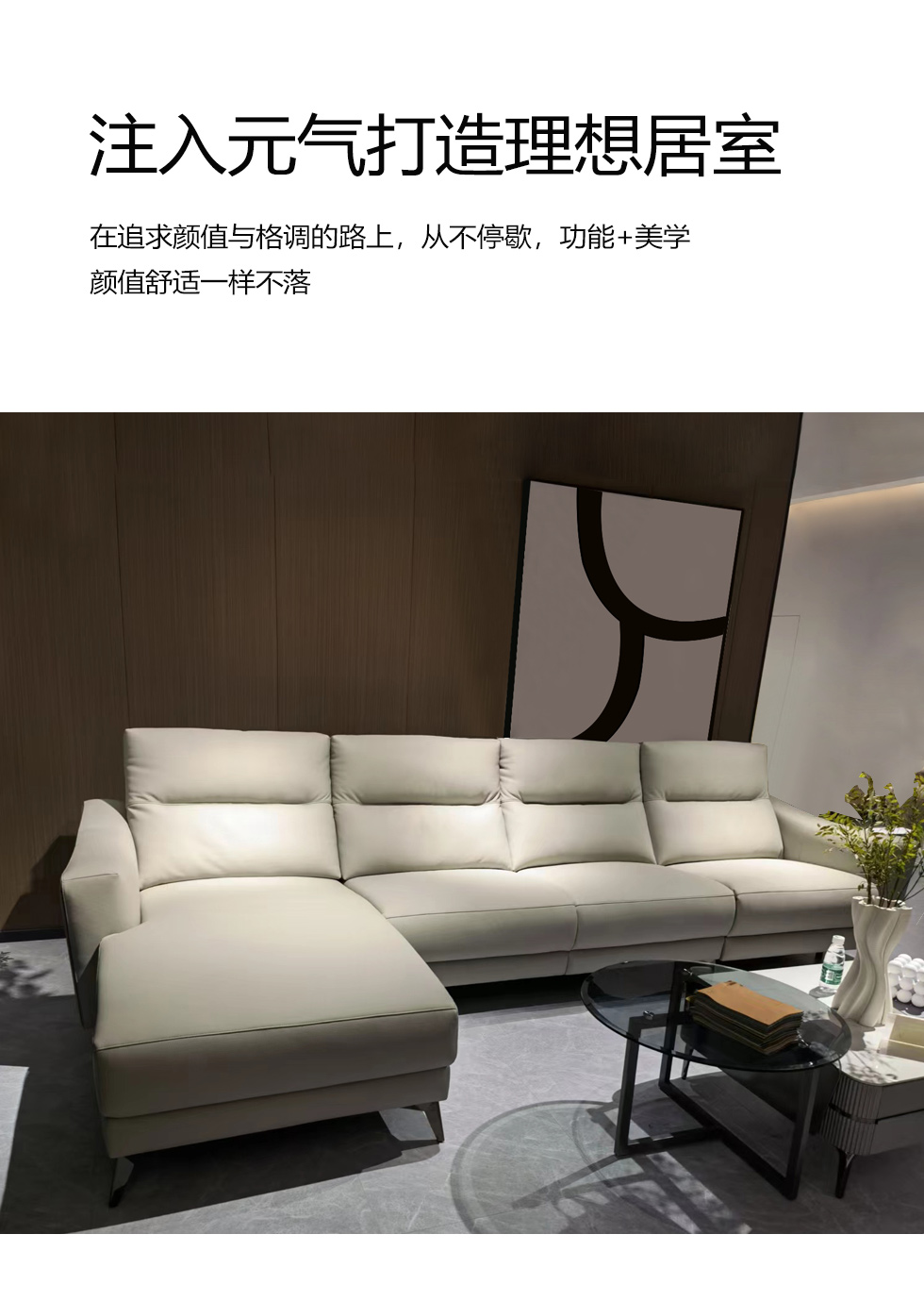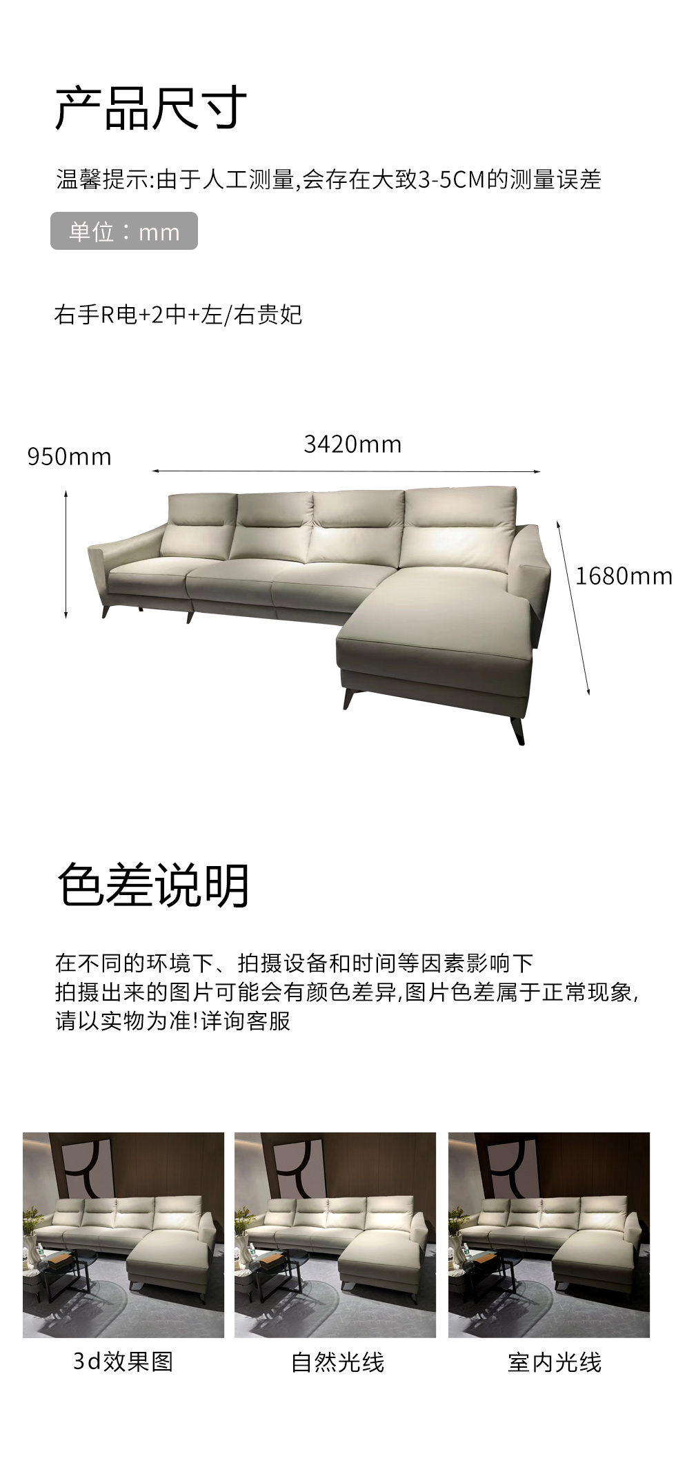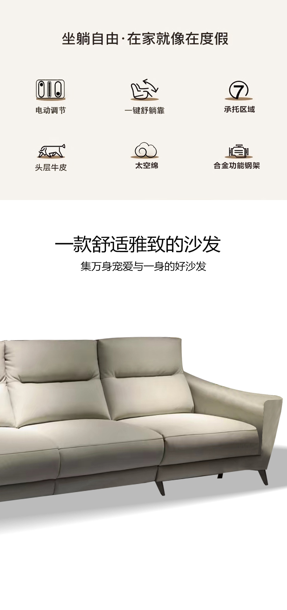 甄品家具 现代简约 接触面进口头层牛皮+进口 落叶松+高 回弹海绵+高承重碳 钢功能架+零靠墙锐迈电机+单电动功能 碳素钢脚 3.1米 三人位 单电动功能沙发
