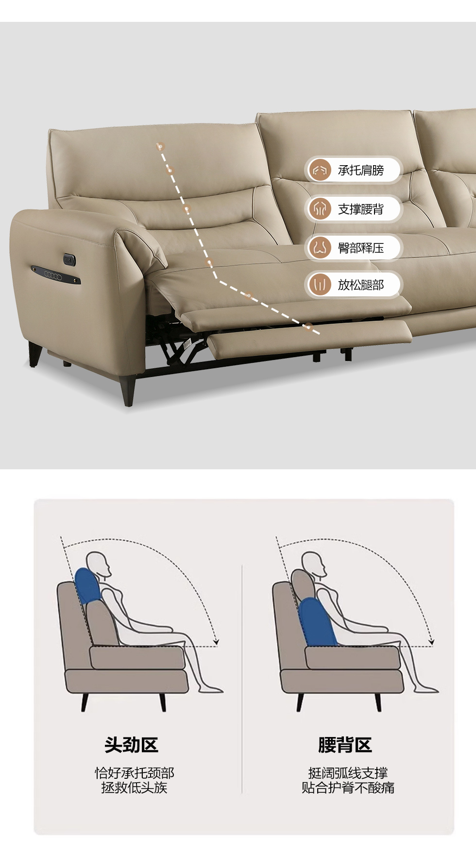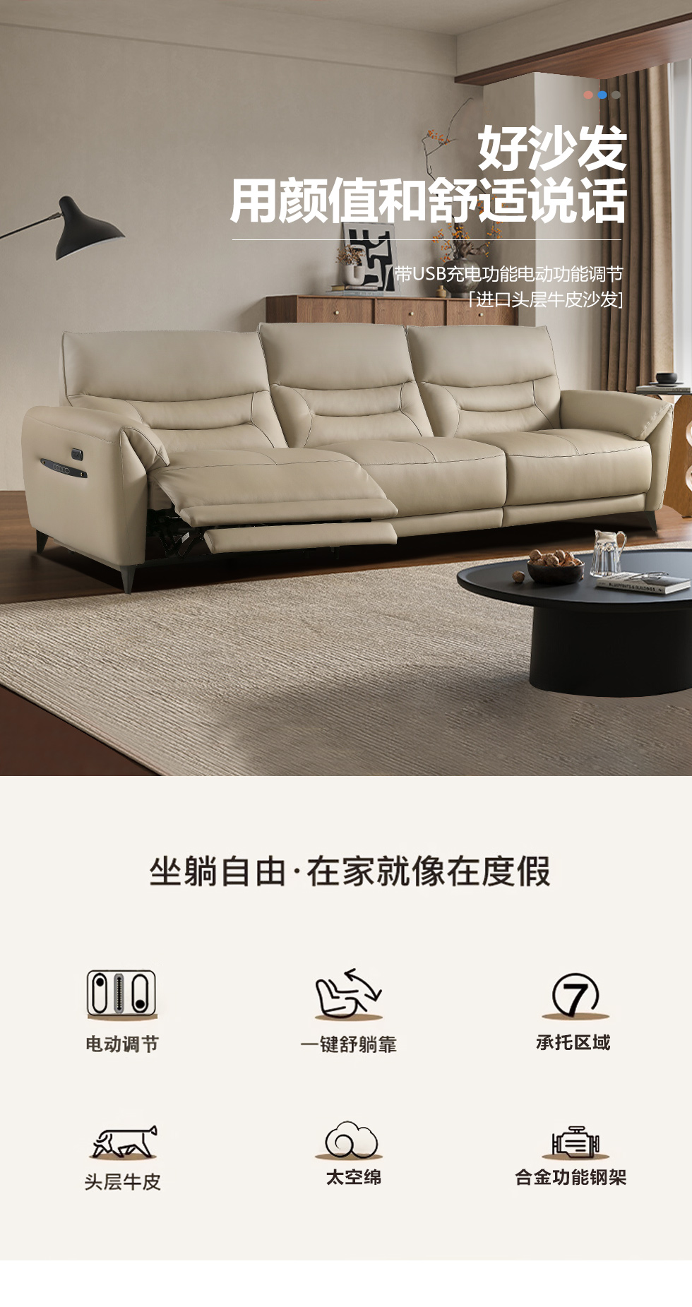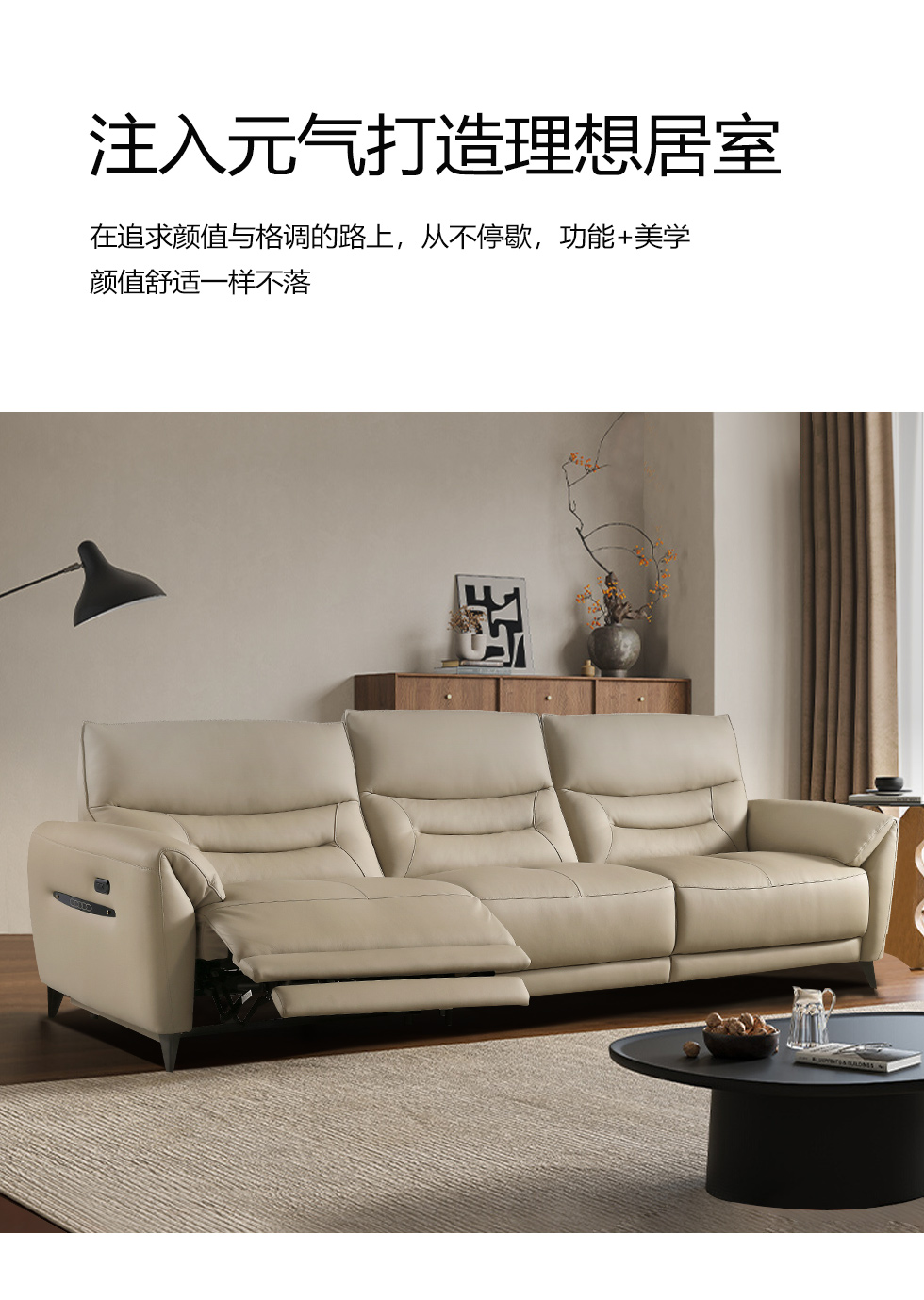 甄品家具 现代简约 接触面进口头层牛皮+进口 落叶松+高 回弹海绵+高承重碳 钢功能架+零靠墙锐迈电机+单电动功能 碳素钢脚 3.1米 三人位 单电动功能沙发