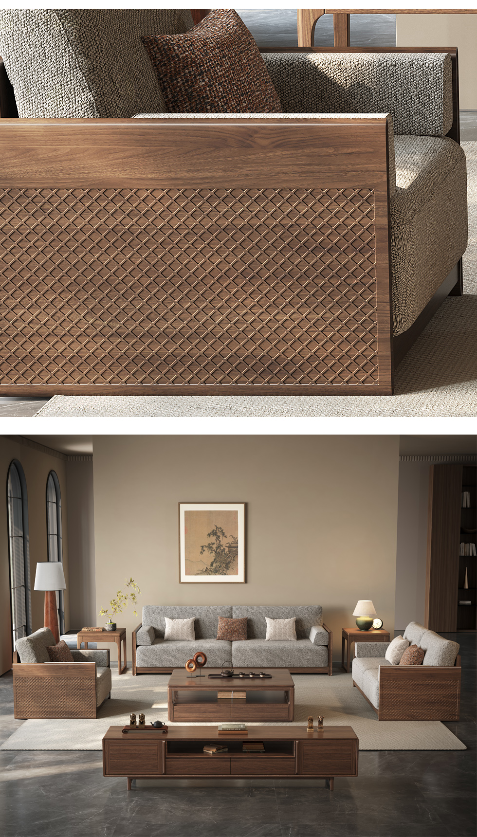 墨云阁 中古风 南美胡桃木+多层实木板+实木内架+高回弹海绵+棉麻 1+3+左贵妃 3.39米沙发