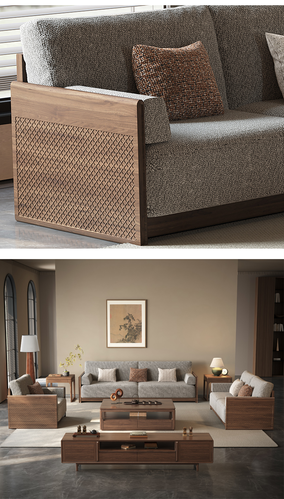 墨云阁 中古风 南美胡桃木+多层实木板+实木内架+高回弹海绵+棉麻 1+3+左贵妃 3.39米沙发