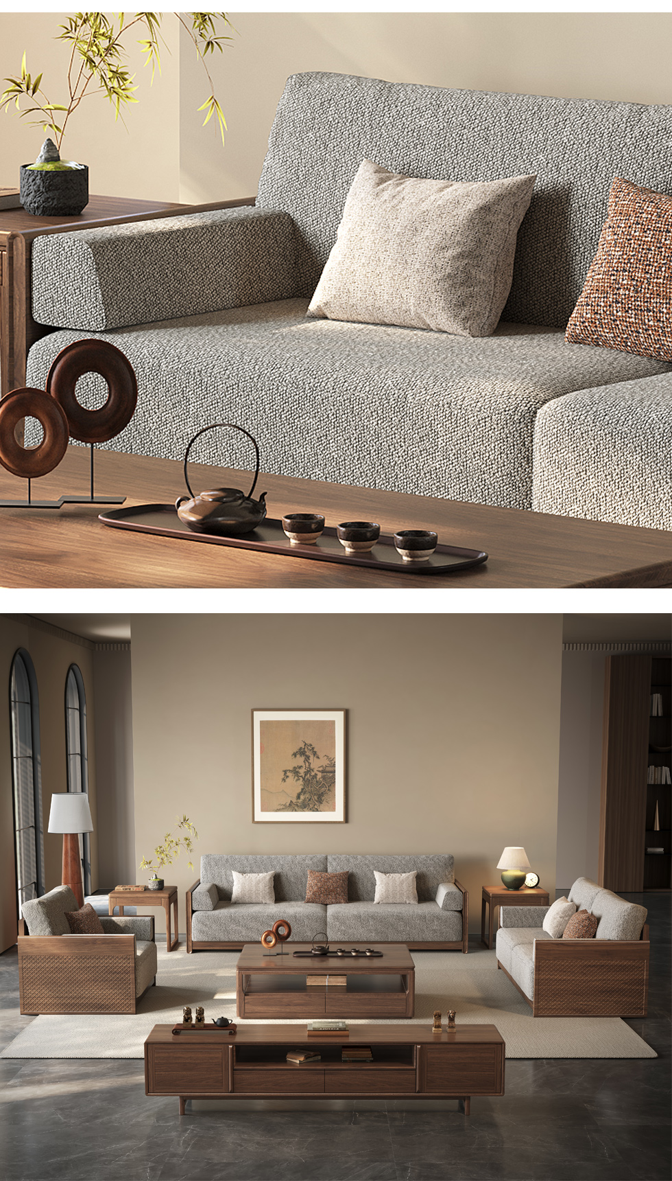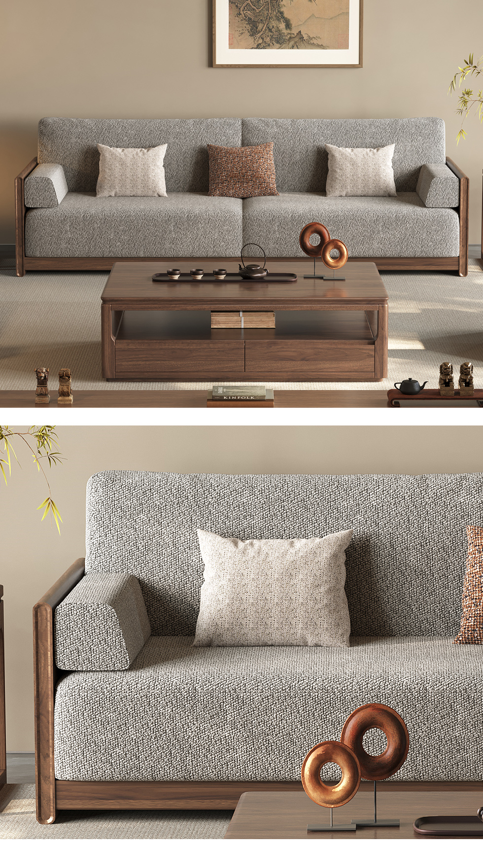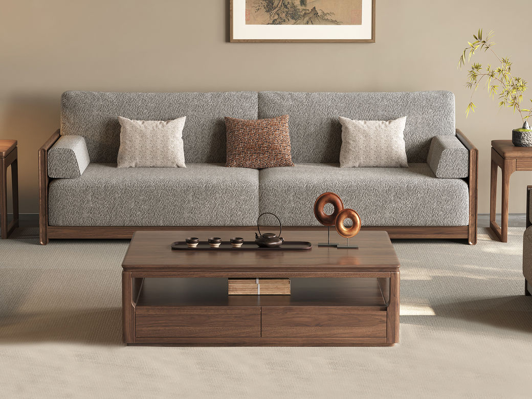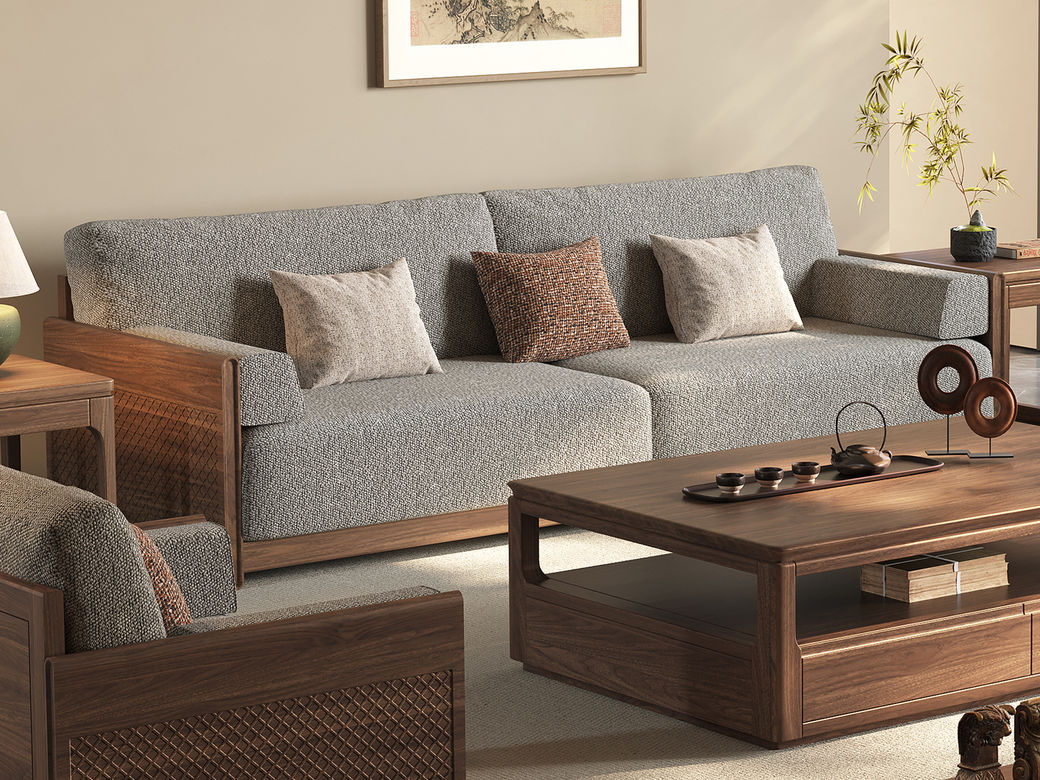 墨云阁 中古风 南美胡桃木+多层实木板+实木内架+高回弹海绵+棉麻 三人位 2.25米沙发 |