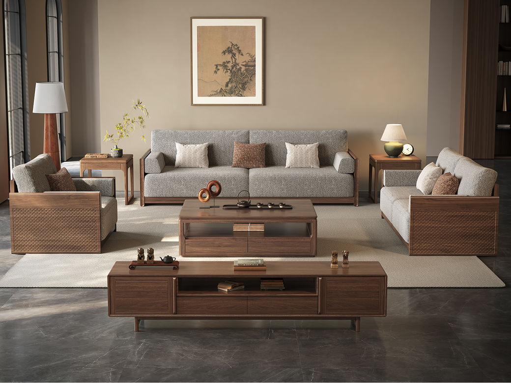 墨云阁 中古风 南美胡桃木+多层实木板+实木内架+高回弹海绵+棉麻 1+3+左贵妃 3.35米沙发