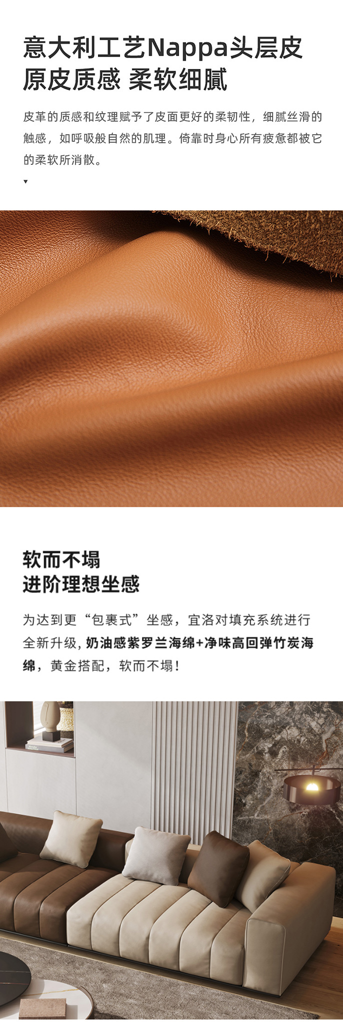 维利品尚 现代简约 接触面头层真皮+靠包:羽绒+高回弹海绵拼架+座包:水洗乳胶+高回弹竹炭海绵+落叶松木+高韧强力绷带+锰钢蛇形弹簧+实木脚 3.4米沙发