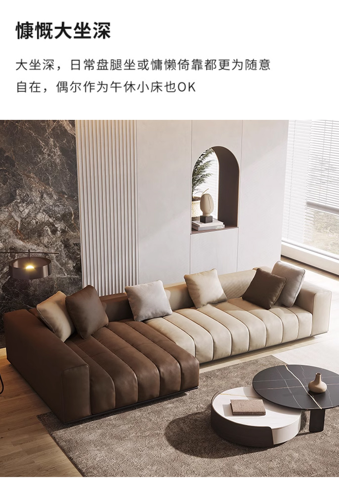 维利品尚 现代简约 接触面原生头层牛皮+靠包/扶手:白鹅羽绒+羽丝棉+包:轻柔丝棉+零压记忆棉+加厚水洗乳胶+高回弹竹炭海绵+框架:落叶松木+多层实木+强力绷带+锰钢蛇形弹簧+不锈钢脚 3.4米沙发¥7748