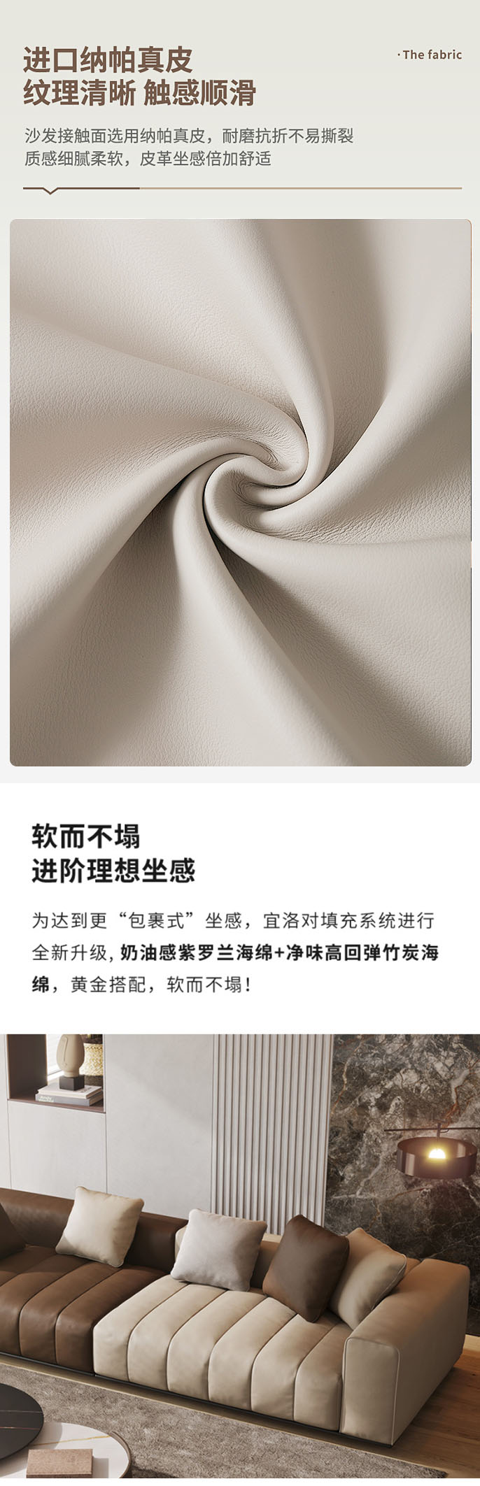 维利品尚 现代简约 接触面头层真皮+靠包:羽绒+高回弹海绵拼架+座包:水洗乳胶+高回弹竹炭海绵+落叶松木+高韧强力绷带+锰钢蛇形弹簧+实木脚 3.4米沙发