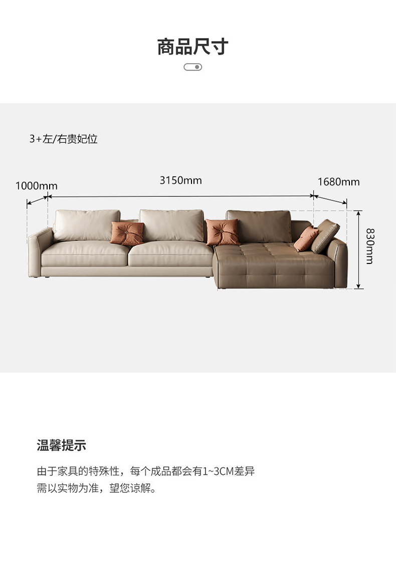 维利品尚 现代简约 接触面头层真皮+进口落叶松木+实木脚 3+左贵妃 3.15米沙发