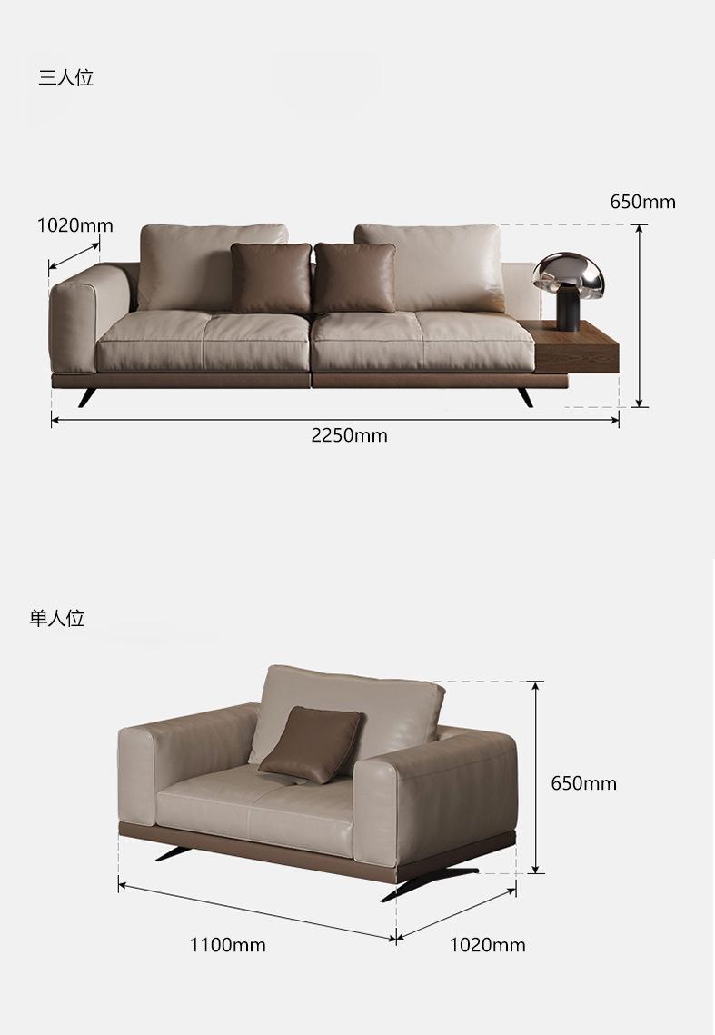 维利品尚 现代简约 接触面头层真皮+多层实木+胡桃色木纹+进口落叶松木+碳素钢脚 脚踏 沙发