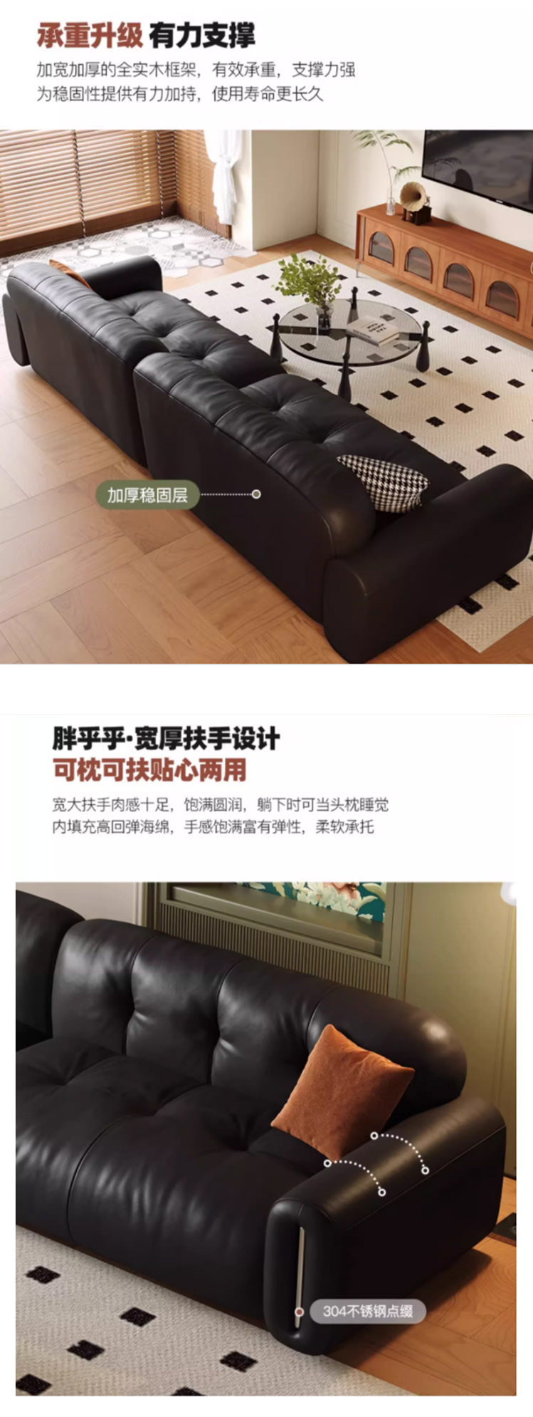维利品尚 现代简约 接触面头层真皮+靠包:羽绒+羽丝棉+座包:水洗乳胶+高回弹竹炭海绵+落叶松木+高韧强力绷带+锰钢蛇形弹簧+五金脚 3.5米沙发¥9314
