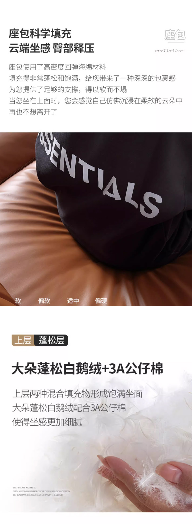 维利品尚 现代简约 接触面头层真皮+靠包:羽绒+羽丝棉+座包:水洗乳胶+高回弹竹炭海绵+落叶松木+高韧强力绷带+锰钢蛇形弹簧+五金脚 3.5米沙发¥9314