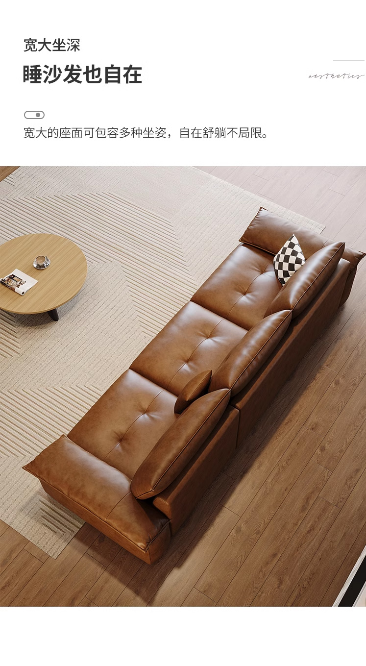 维利品尚 中古风 接触面复古油蜡真皮+框架:俄罗斯松木+实木脚 五人位 3.4米沙发