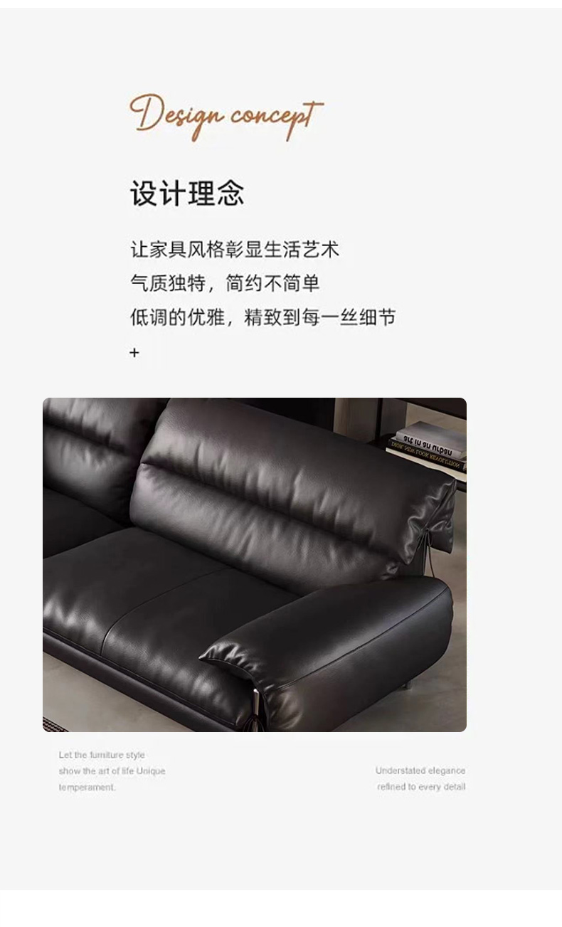 维利品尚 现代简约 接触面头层真皮+靠包:羽绒+羽丝棉+座包:水洗乳胶+高回弹竹炭海绵+落叶松木+高韧强力绷带+锰钢蛇形弹簧+五金脚 3.5米沙发¥9314
