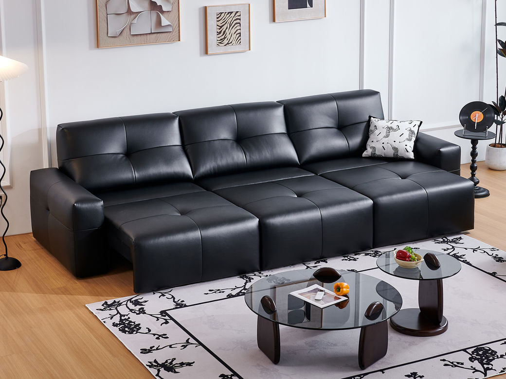 梵纳意简 极简 接触面头层真皮+仿真皮+实木+多层实木板+静音平推功能电机 黑色 四人位(三电动) 电动功能3.25米沙发