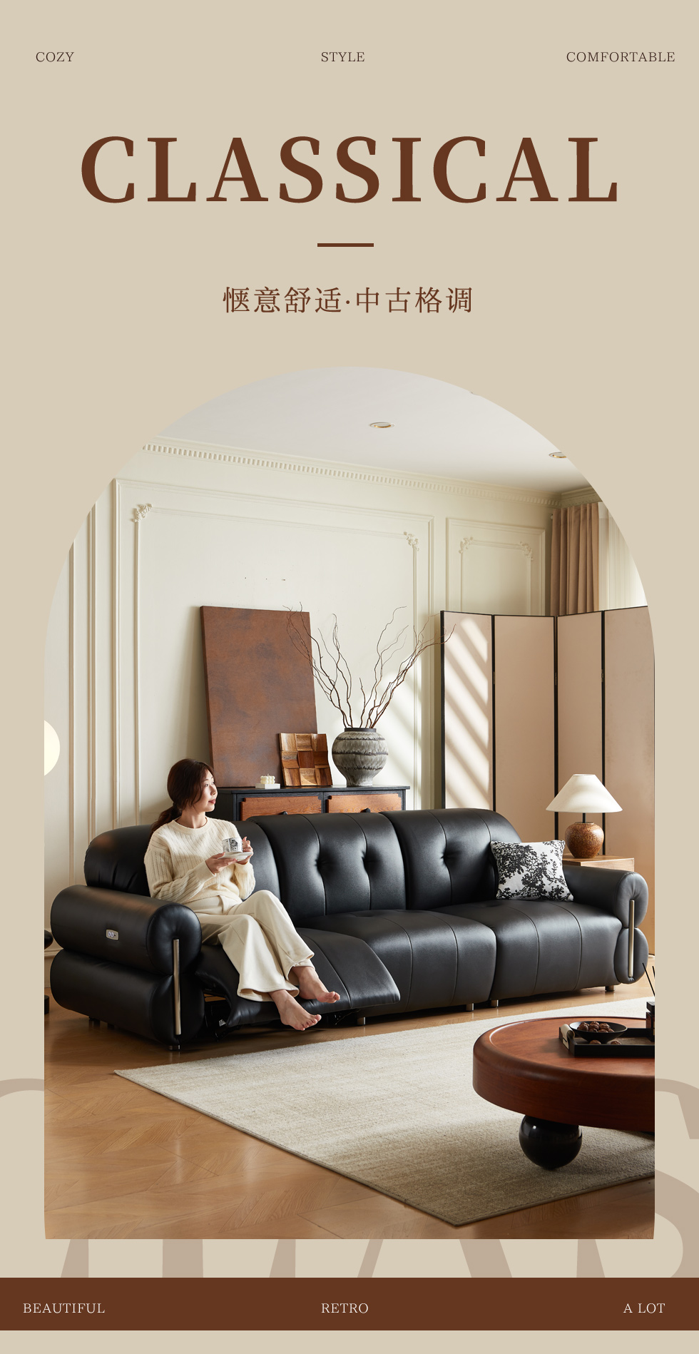 中古·尚 中古风 接触面头层真皮+仿真皮+实木+多层实木板+静音平推功能电机 黑色 双人位(双电机) 电动功能2.52米沙发