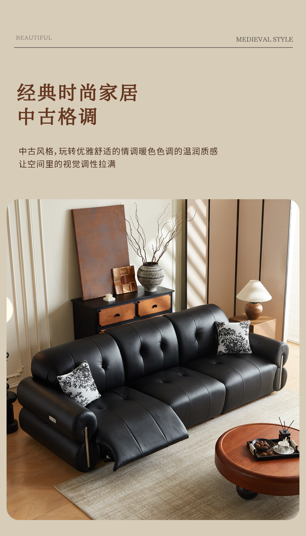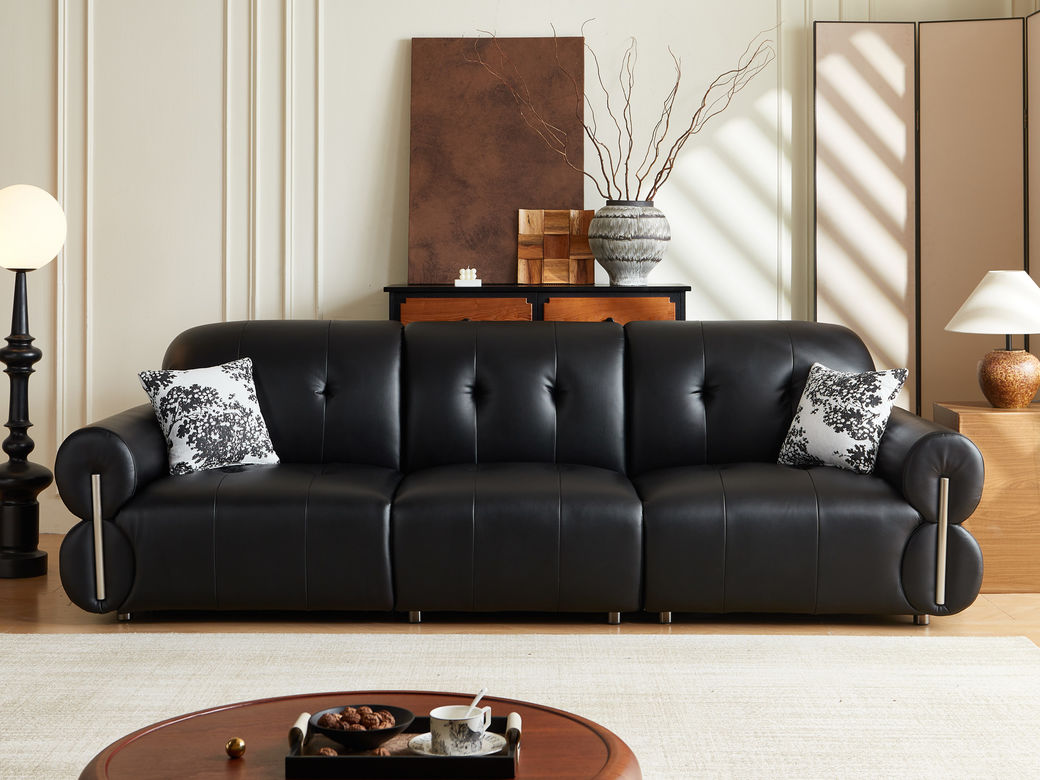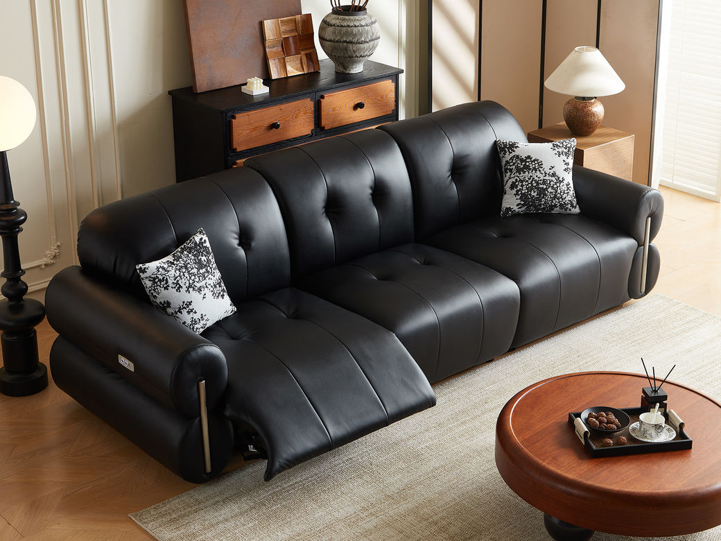 中古·尚 中古风 接触面头层真皮+仿真皮+实木框架+多层实木板+静音功能电机 黑色 三人位单功能 电动功能2.8米沙发