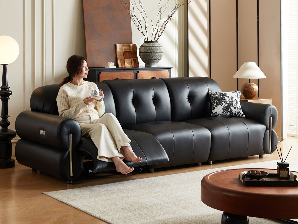 梵纳意简 极简 接触面头层真皮+仿真皮+实木+多层实木板+静音平推功能电机 黑色 四人位(三电动) 电动功能3.25米沙发