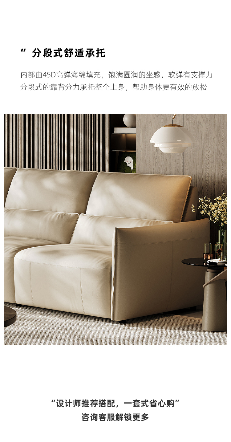 接触面洛萨 现代 俄罗斯进口松木内架稳固承重耐用 性强 高回弹足45密度海绵舒适海绵填充靠 背舒爽透气不塌陷 优质羽绒包裹感好轻松释放压力 右功能单+中单+左扶单 电动功能2.33米沙发