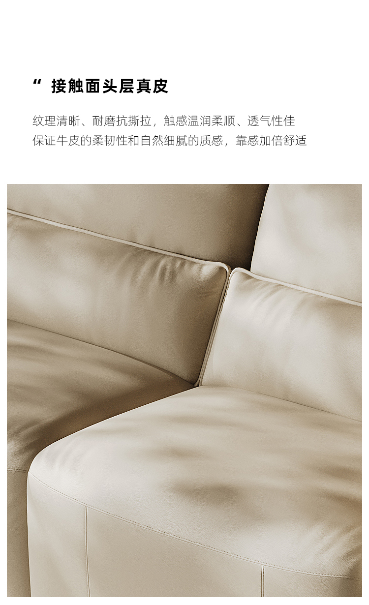 皇朝家居 现代极简 接触面轻压摔头层黄牛皮(皮等级P2)+高回弹+桉木足方+E1双面杨木夹板+优质白鹅绒公仔棉+五金脚 三人位 3.02米沙发