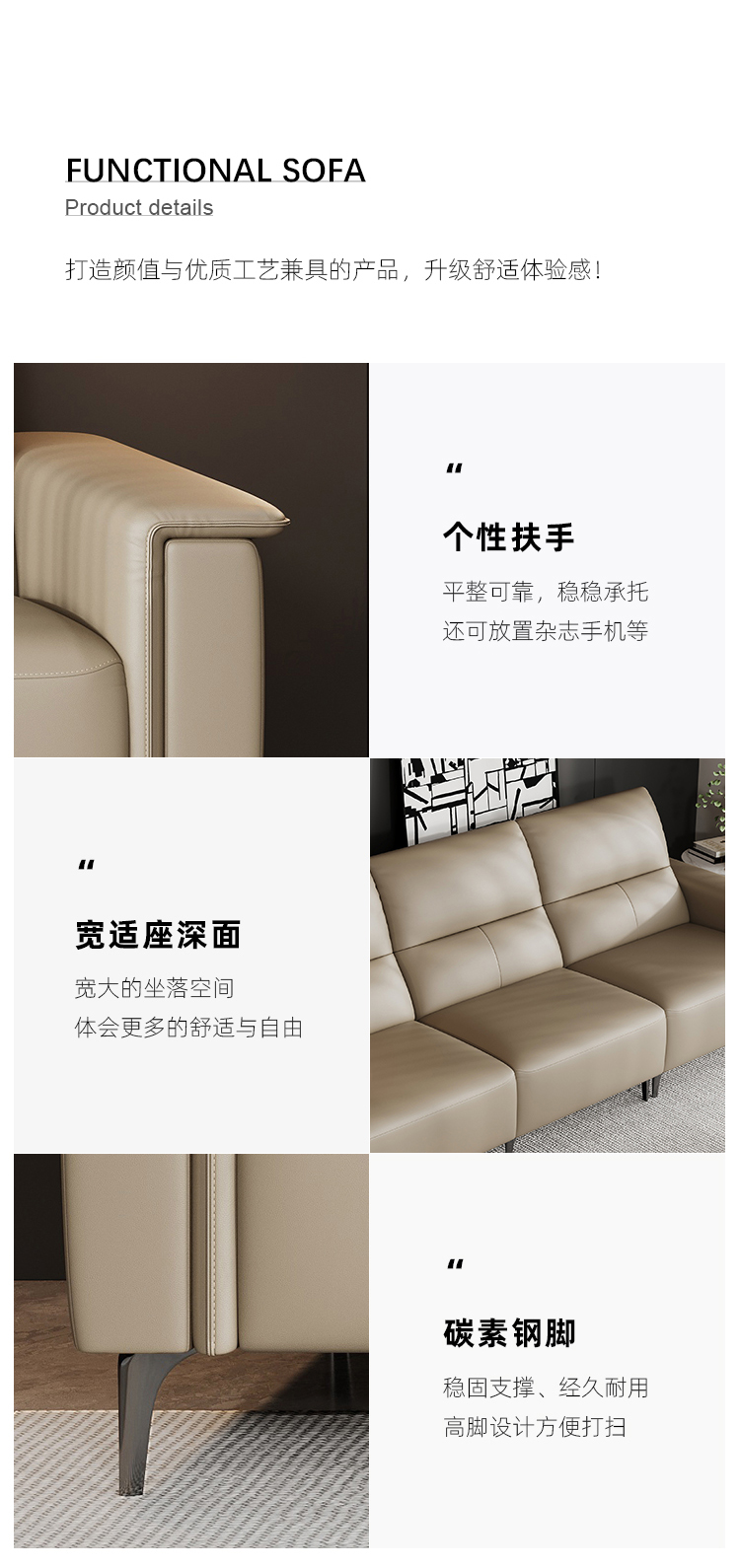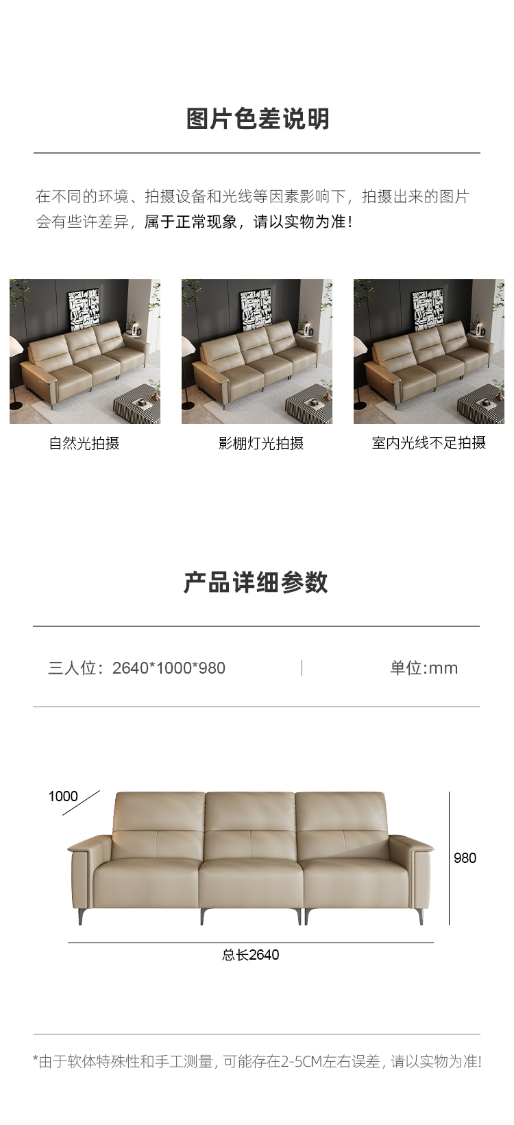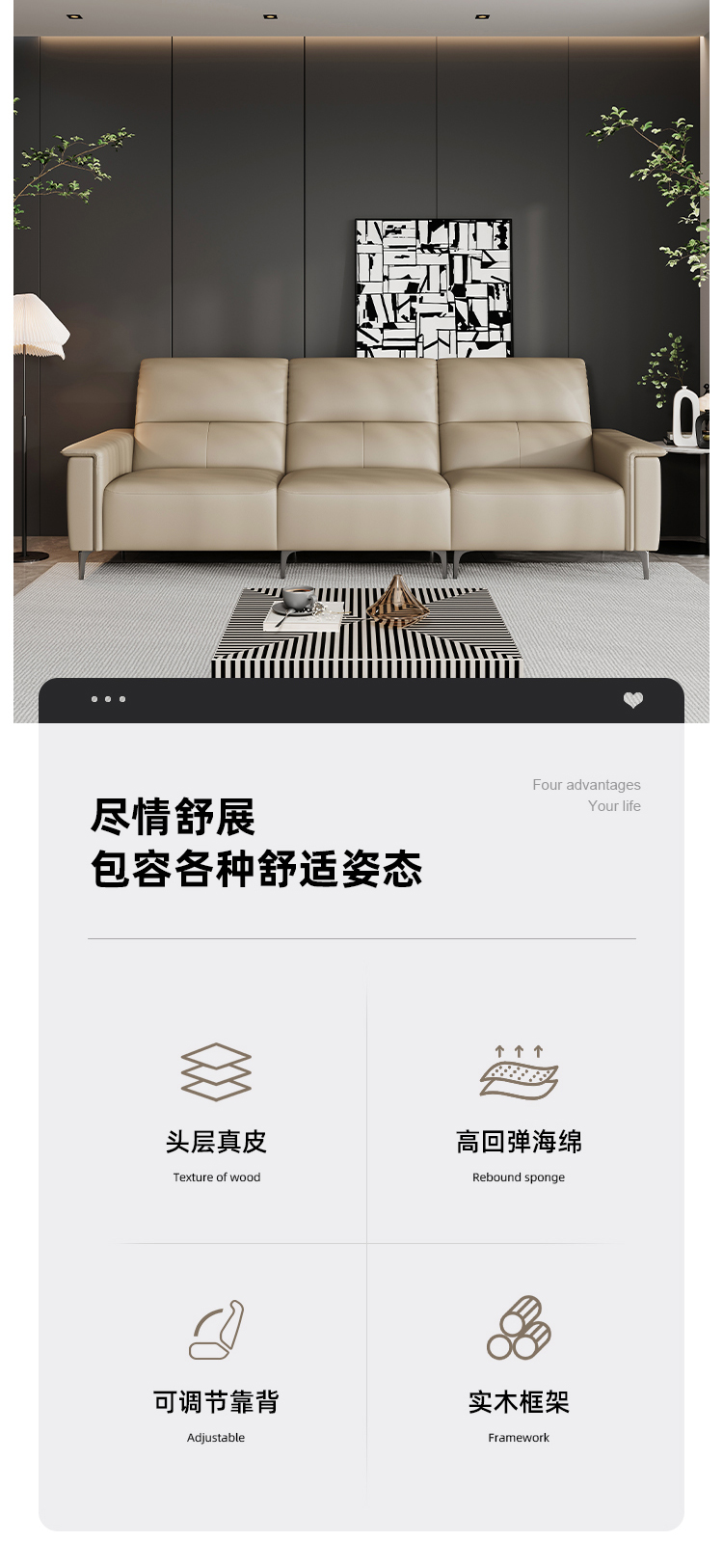 洛萨 现代 接触面真皮+高回弹海绵+俄罗斯落叶松实木框架 左扶单+中单+右功能单位 功能2.64米沙发