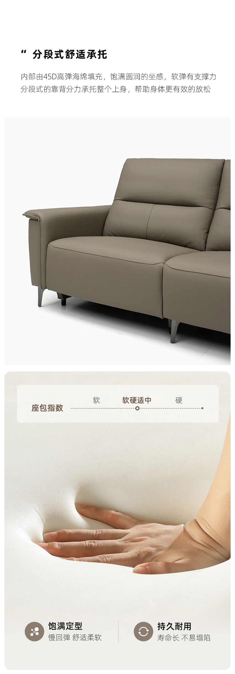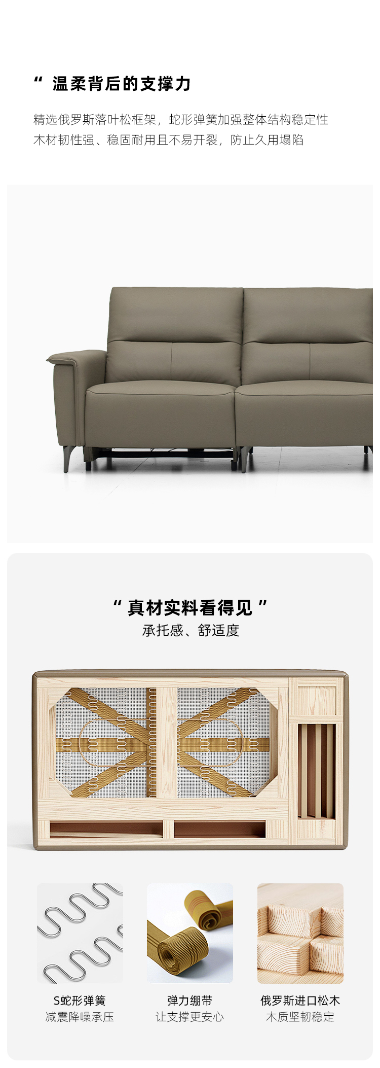 接触面洛萨 现代 俄罗斯进口松木内架稳固承重耐用 性强 高回弹足45密度海绵舒适海绵填充靠 背舒爽透气不塌陷 优质羽绒包裹感好轻松释放压力 右功能单+中单+左扶单 电动功能2.33米沙发