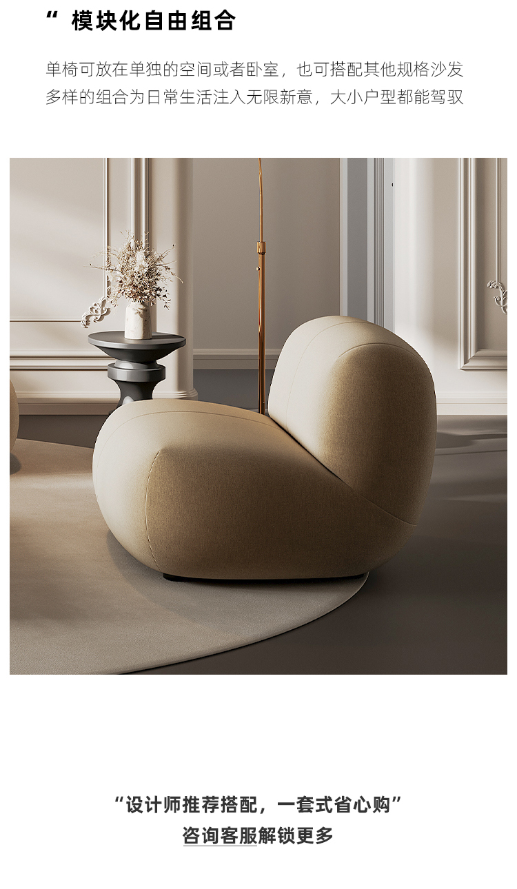 贝斯solo 设计师 网红 极简 布艺 俄罗斯进口落叶松 优质高回弹海绵靠包 单人位 河马1米沙发