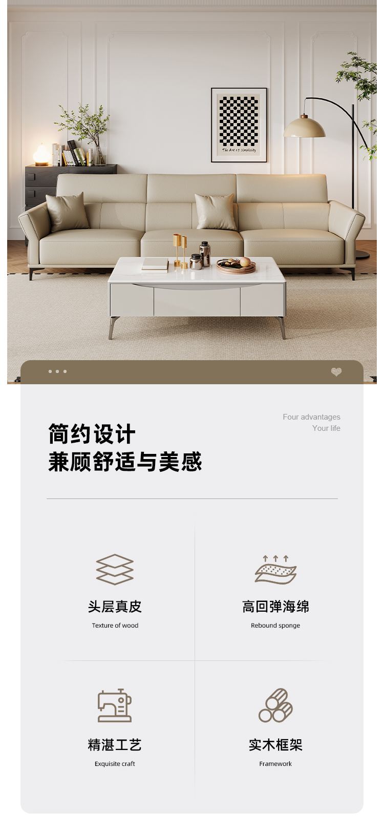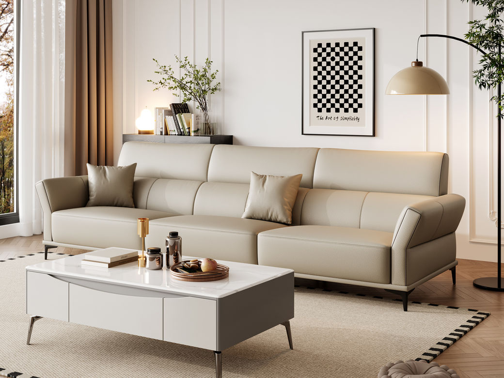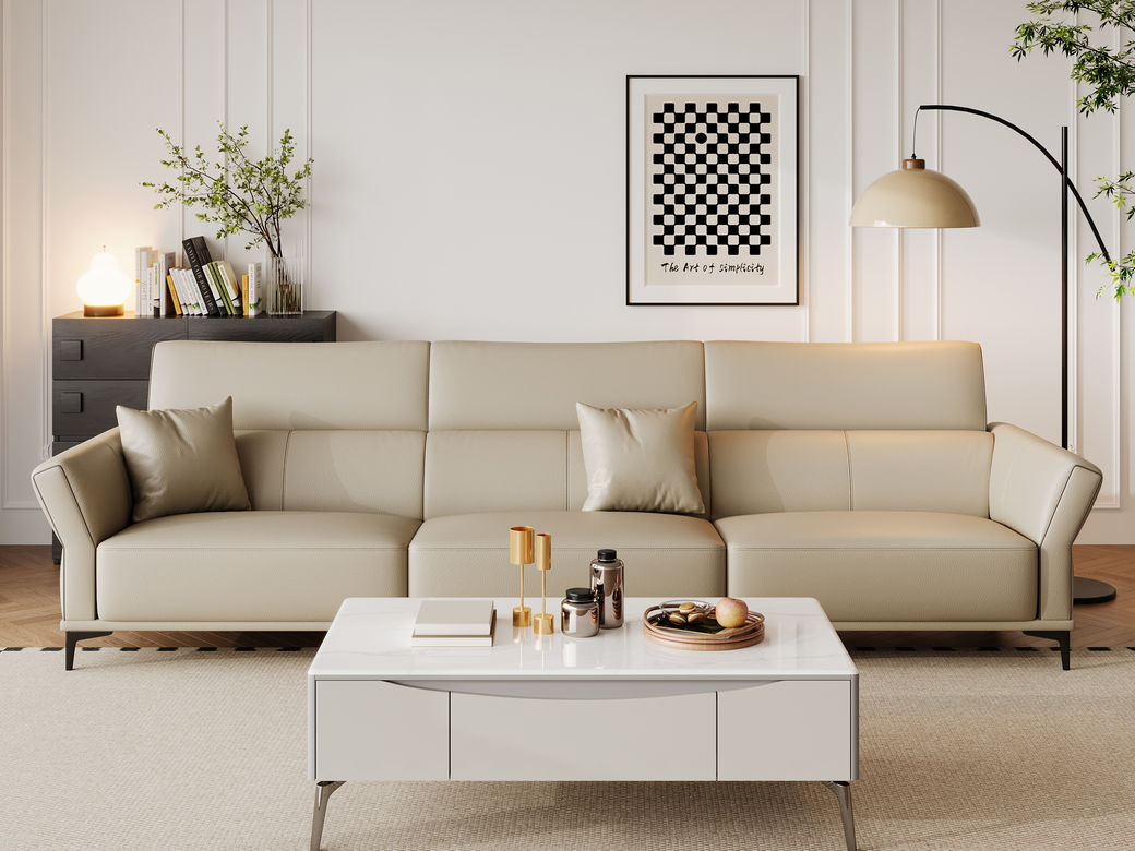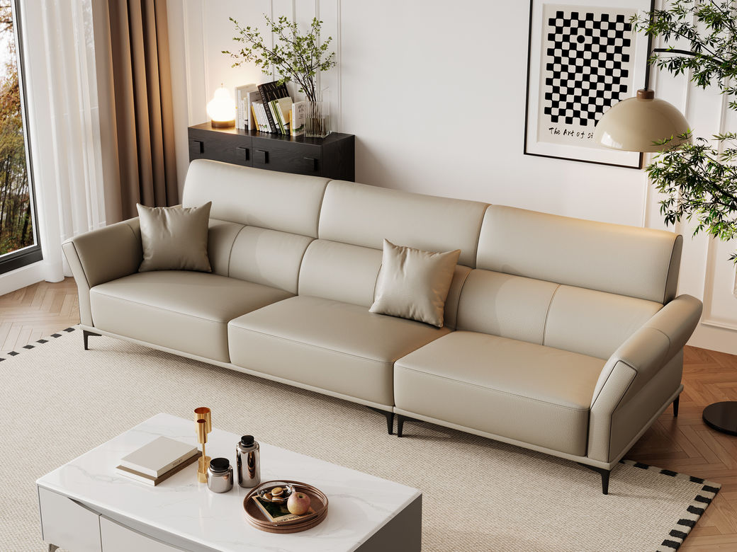 帝幔佧 极简 接触面真皮-全实木框架+高密度海绵 电镀银色碳素钢脚 四人位 真皮2.7米沙发¥17615
