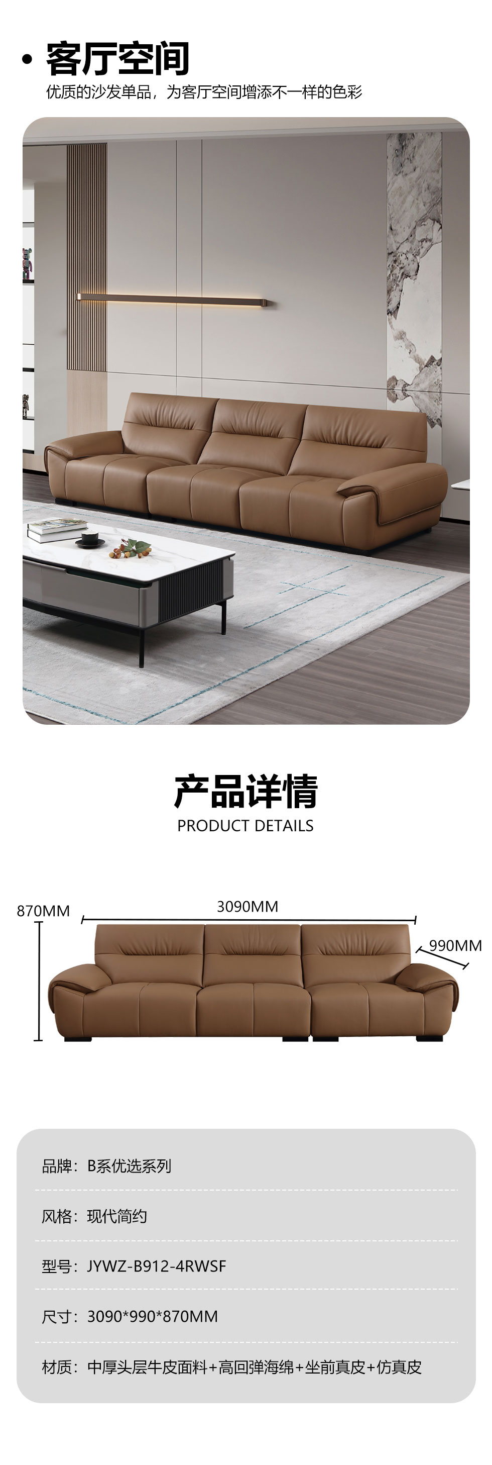 B系优选 现代简约 接触面中厚头层牛皮面料+进口俄罗斯松木框架+高回弹海绵+坐前真皮+仿真皮 四人位 3.09米沙发