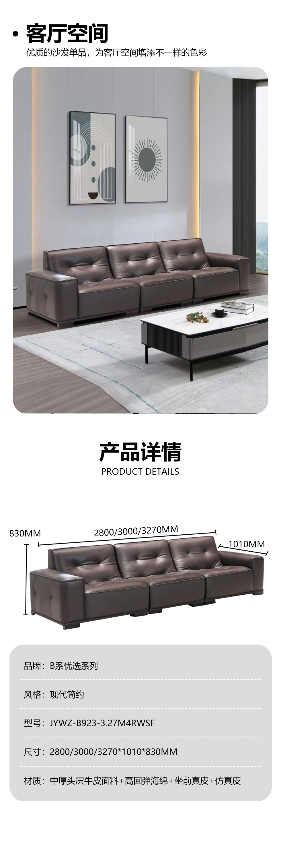 B系优选 现代简约 接触面中厚头层牛皮面料+进口俄罗斯松木框架+高回弹海绵+仿真皮 四人位 3.27米沙发