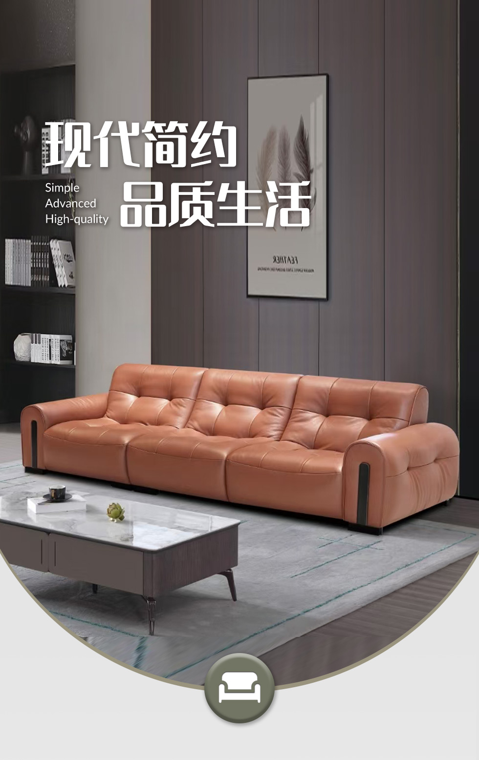 B系优选 现代简约 接触面头层黄牛皮+仿皮 E1级夹板+松木框架 无粉海绵 靠包赛羽绒+公仔棉填充 样色 直排3.2米四人位 皮艺沙发