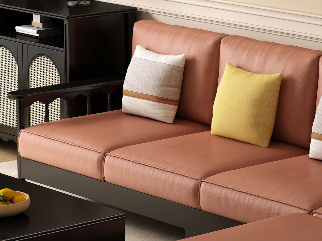 木作中古 中古风 橡胶木+科技布 四人位+脚踏 樱桃色 3.02米沙发