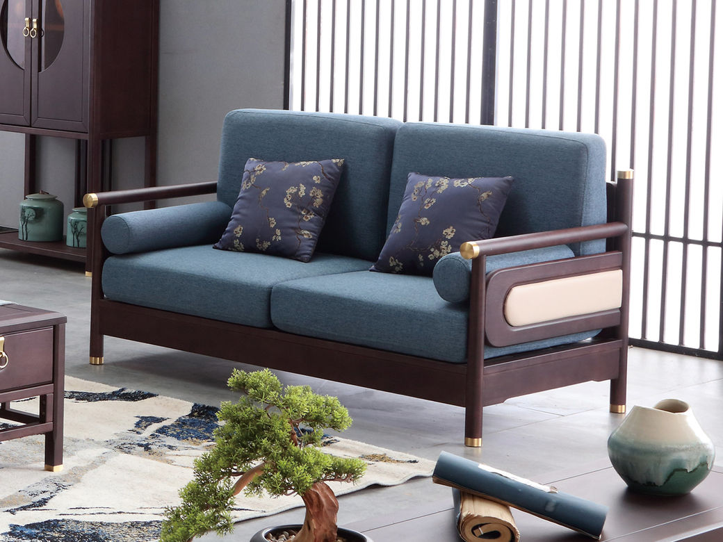 山止 新中式 橡胶木框架+实木多层板座板+科技布坐垫+高密度海绵 双人位 1.59米沙发
