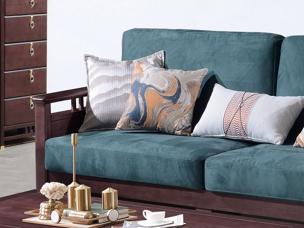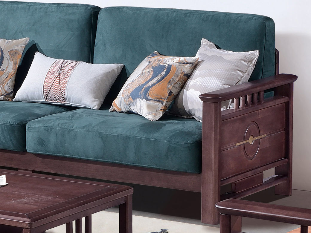 山止 新中式 橡胶木+绒布+实木多层座板+高回弹海绵 三人位 2.19米沙发