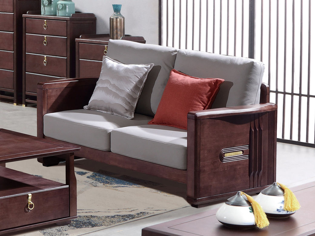 山止 新中式 橡胶木框架+实木多层板座板+科技布坐垫+高密度海绵 双人位 1.54米沙发