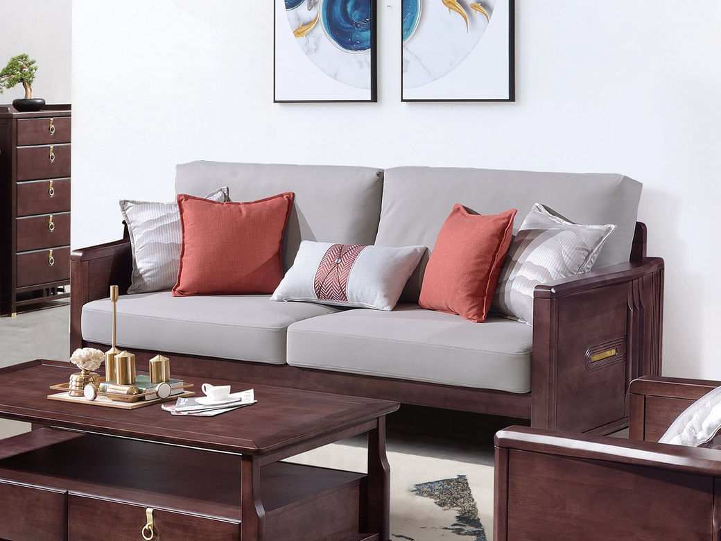 山止 新中式 橡胶木框架+实木多层板座板+科技布坐垫+高密度海绵 三人位 2.195米沙发¥7478