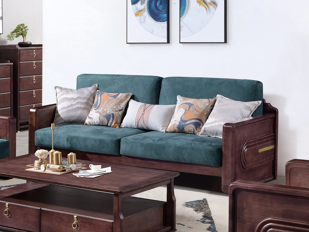 山止 新中式 橡胶木框架+实木多层板座板+绒布坐垫+高密度海绵 三人位 2.17米沙发