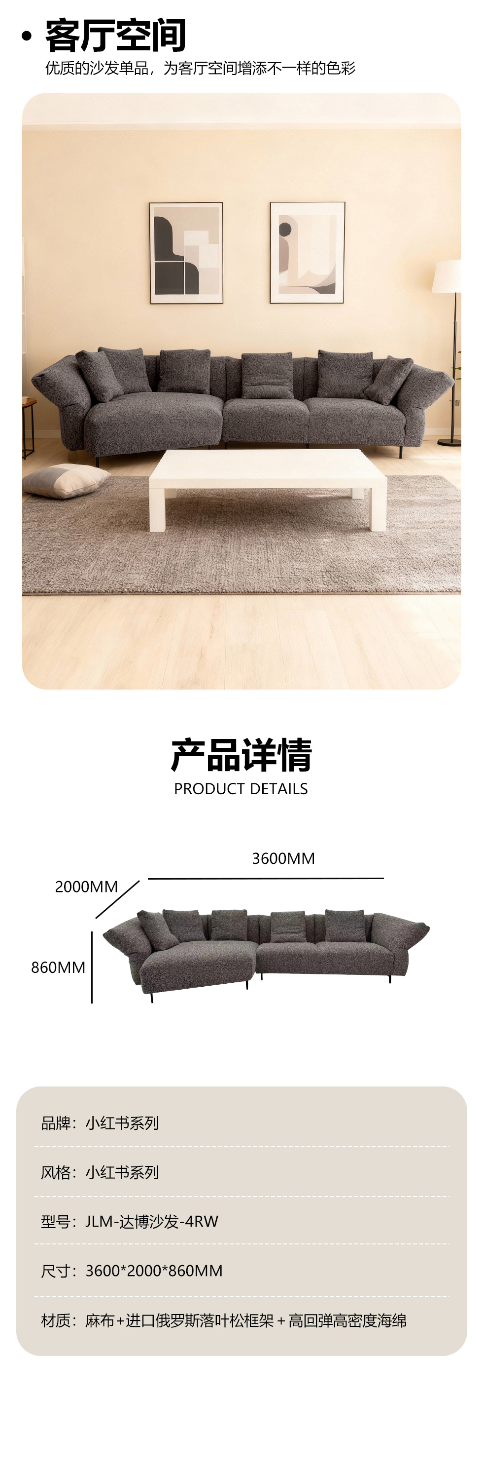 小红书系列 极简 麻布+进口俄罗斯落叶松框架:高回弹高密度海绵 3.6米沙发