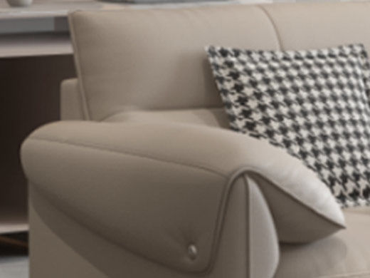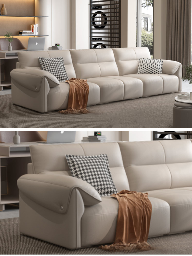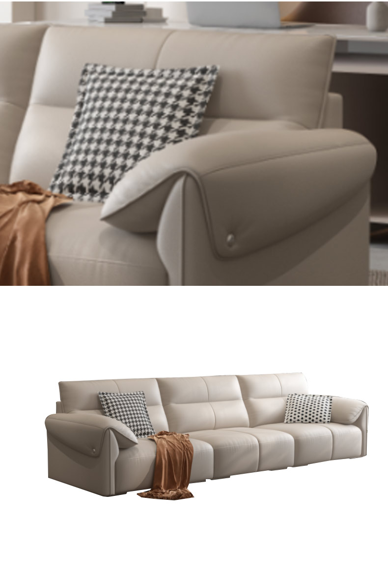 A系优选 极简,极简 生态真皮+仿皮+多层实木板+实木内架+高回弹海绵+实木5分脚 米黄色 大四位 3.44米沙发